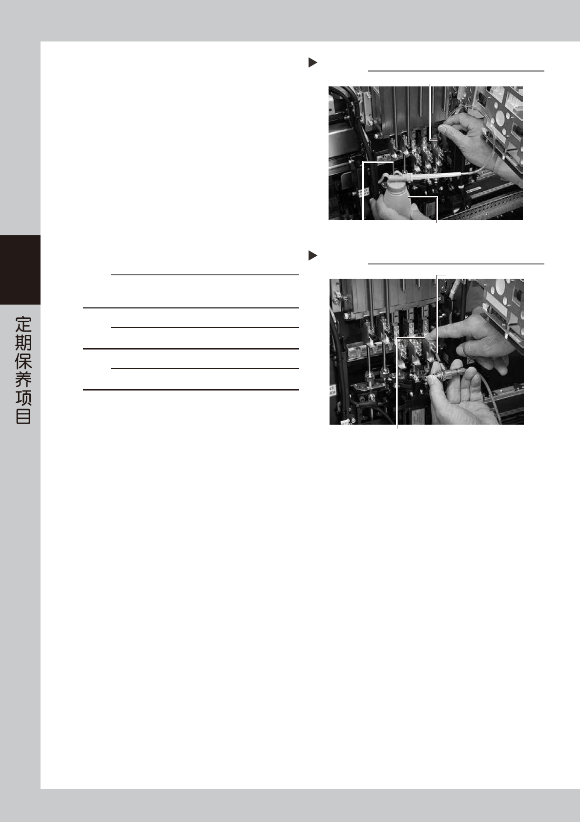 3-26 3 8 清洗花键轴内部。 1. 将清洗工具的注嘴插入花键轴内。 2. 注入 IPA 清洗花键轴的气路。 55328-L6-00 9 对花键轴的气路进行喷气。 1. 准备喷气工具 ( 选购件 ),与邻近的设备连接。 2. 在准备喷气的贴装头的正下方放置无尘布。 3. 为使喷出的空气不致漏出,用手指堵住拆下盖 螺栓的位置之后,用喷气工具对花键轴内进行 喷气。 4. 反复喷气,直到不再有脏污流到挡在花键轴前 端的无尘布上。 5. 装…