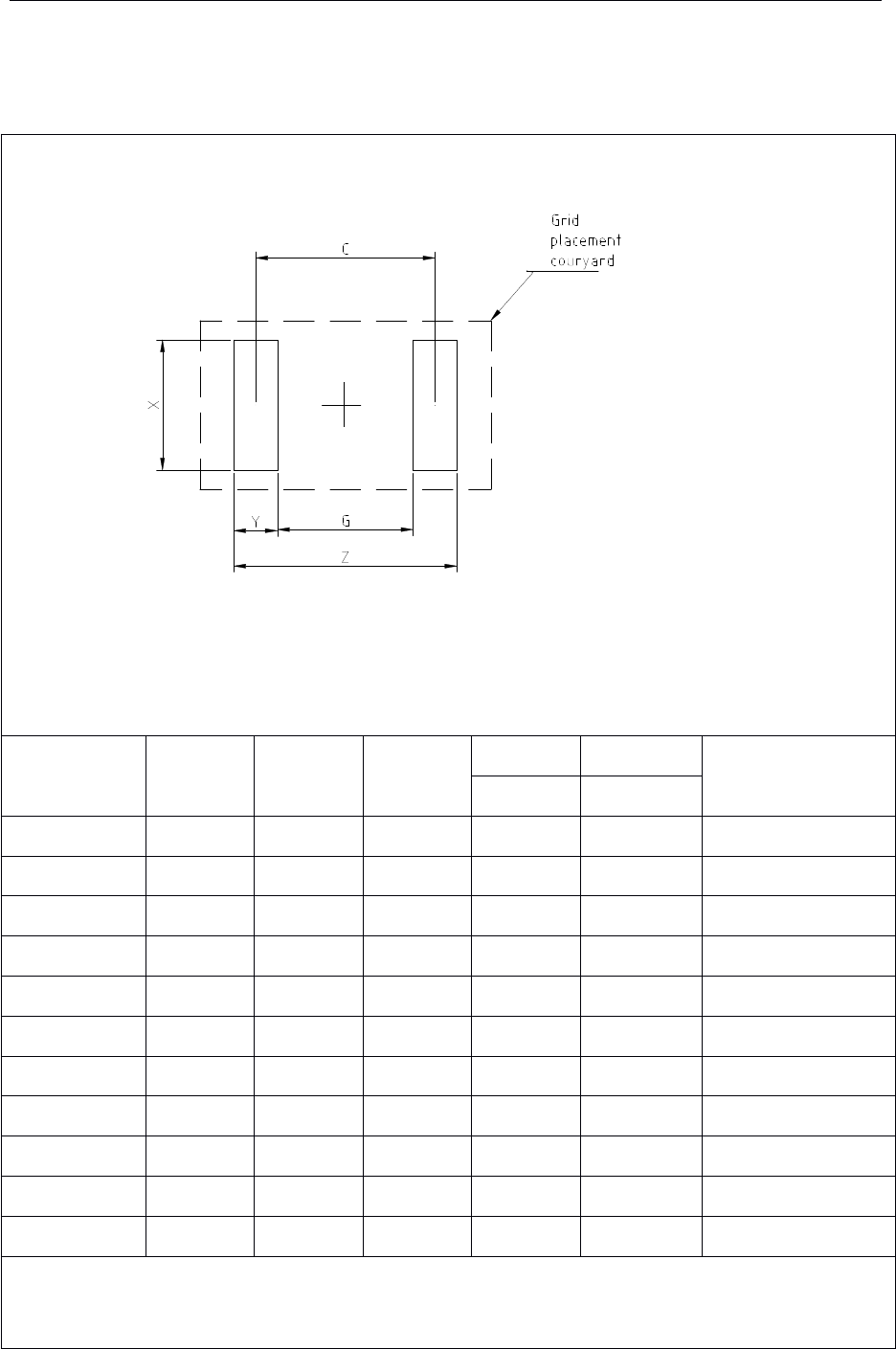 Q/Z X - 2000 11 6.1.2.2 SMD 电容焊盘尺寸 SMD 电容焊盘尺寸 应符合图 10 的规定。见图 10: 图 10 SMD 电容焊盘尺寸 封装名称 Z (mm) G(mm) X(mm) Y(mm) C(mm) 区域网格 (网格单元号 码) ref ref 0402C 1.60 0.40 0.70 0.60 1.00 2×4 0504C 2.00 0.40 1.30 0.80 1.20 4×6 0603C 2.80…