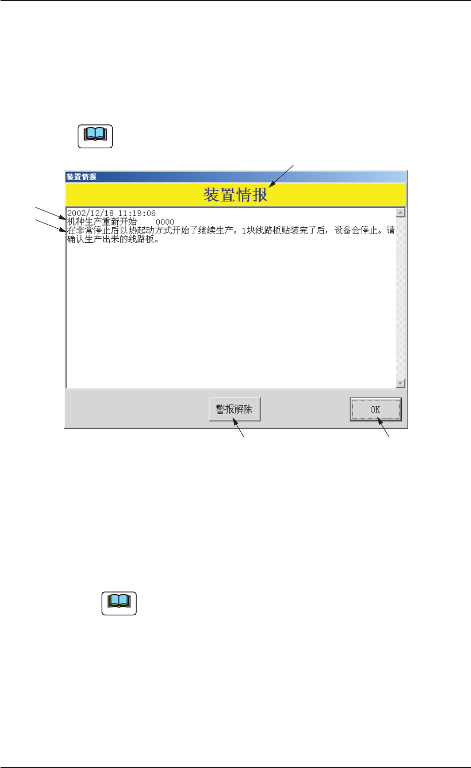 *4 *4 *4 *4 *4 [OK] [OK] [OK] [OK] [OK] 按钮 按钮 按钮 按钮 按钮 清除装置情报界面。 *5 *5 *5 *5 *5 [ [ [ [ [ 警报解除 警报解除 警报解除 警报解除 警报解除 ] ] ] ] ] 按钮 按钮 按钮 按钮 按钮 按此按钮,只能解除异常音。 1.3 1.3 1.3 1.3 1.3 装置情报 装置情报 装置情报 装置情报 装置情报 0308-001 2 - 12