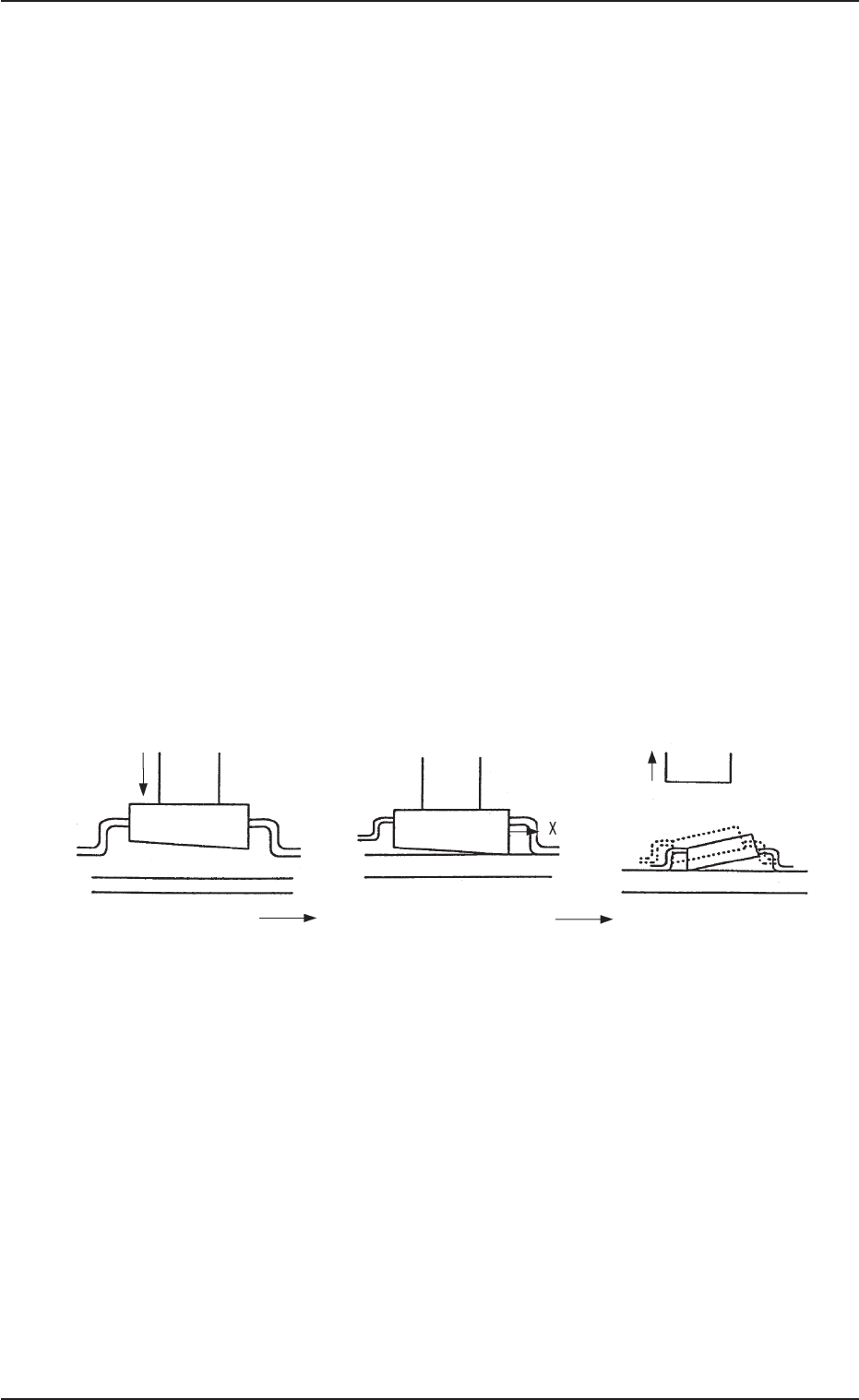 ( 1 -3) 发生在工序 D ~ E 的情况 在两面胶带上没有位置错位的情况,可能是工序 D ~ E 的位置错位。 这时的现象为 • 贴装瞬间错位。 • 贴装后的下一个贴装动作出错位。 • 贴装后的线路板排动作出错位。 共同影响这些的有元件形状,底座状态,结合胶或者黏着剂的条 件。 Fig.4B36 是因元件上面与底面的平行度错位,安装瞬间错位的情况 的例子。 贴装时,在元件下面黏着在底座的瞬间,产生元件向 X 方向移动的 力,形成贴…