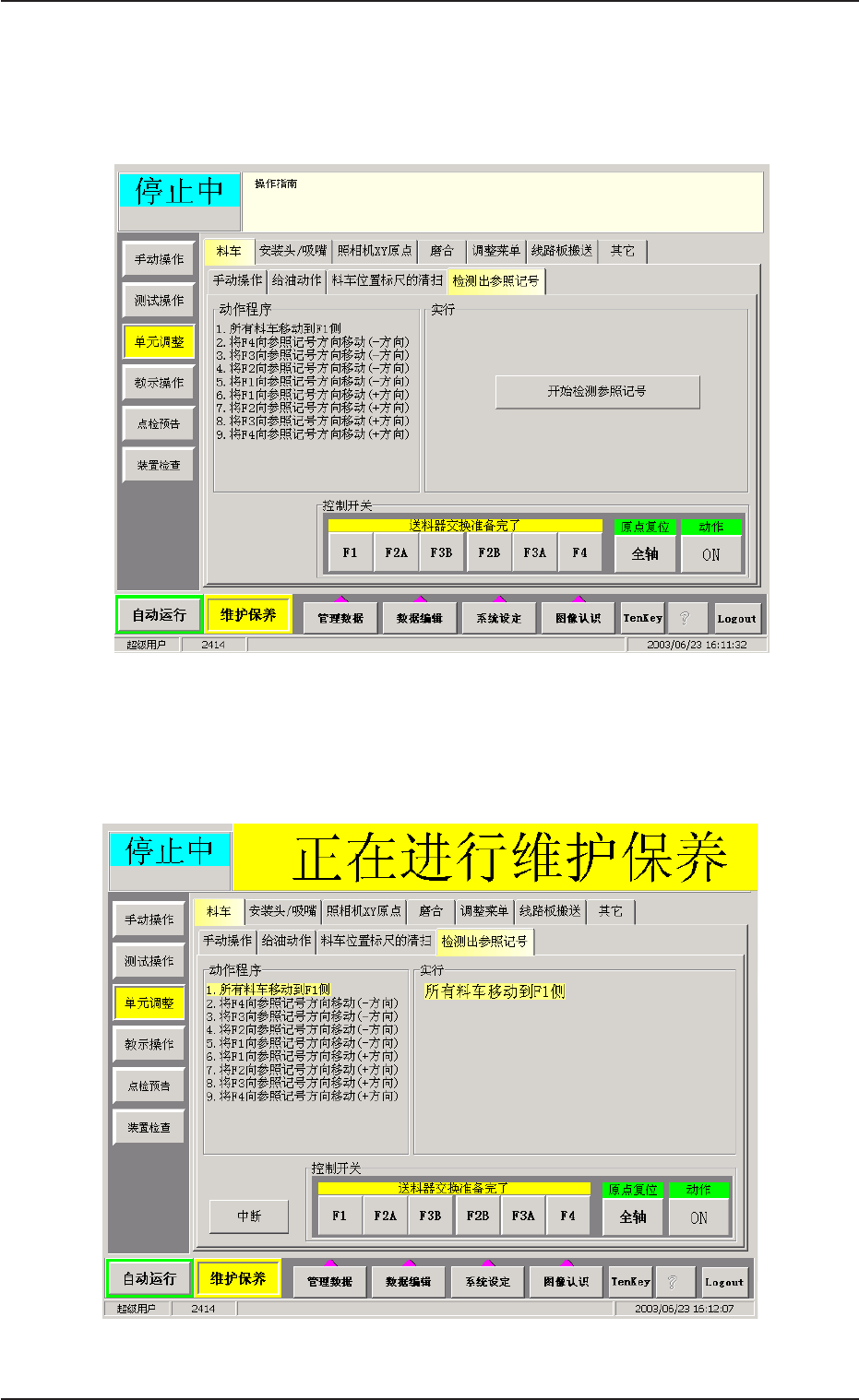 1.4 1.4 1.4 1.4 1.4 维护 维护 维护 维护 维护 · · · · · 保养方法 保养方法 保养方法 保养方法 保养方法 0308-001 1 - 74 (16-3) 按动作 [ON] 按钮,在 2 秒钟内按下操作台的 [ENABLE] 按 钮,料车 3 、 4 向 F1 原点方向移动,显示如下界面。 Fig.4A85-13 Fig.4A85-13 Fig.4A85-13 Fig.4A85-13 Fig.4A85-13…