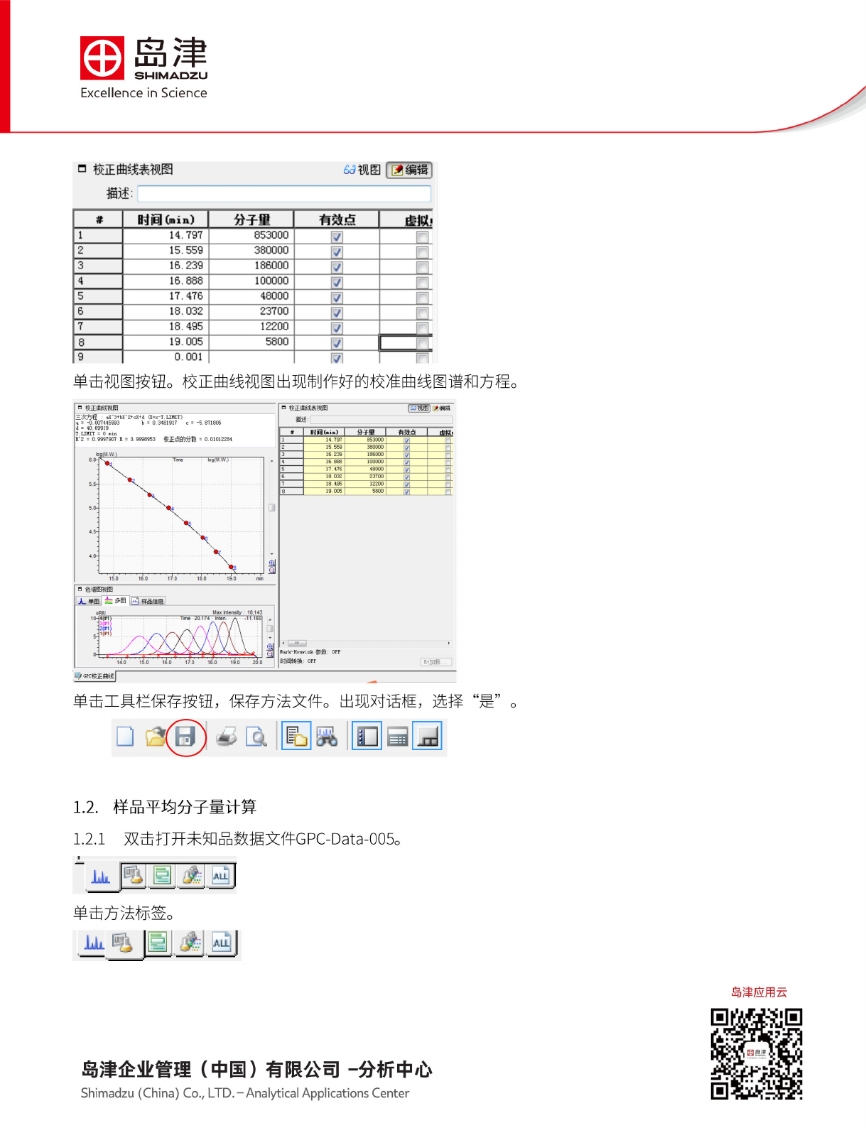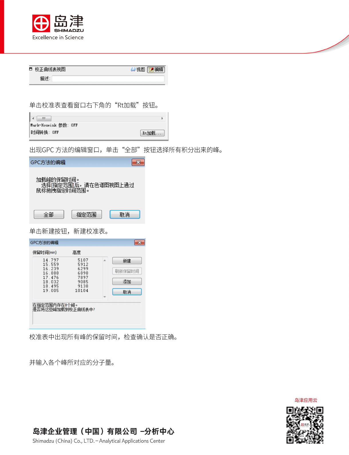 岛津 SHIMADZU Excellence in Science n 校 正曲线 表视图 刈视图 直赢 描述: 时间加 in) 分子里 有效点 虚澳 1 14.797 853000 防 2 15. 559 380000 V 3 16. 239 186000 V 4 16. 888 100000 V 5 17. 476 48000 y 6 18. 032 23700 q 7 18. 495 12200 V 8 19. 005 5800 …