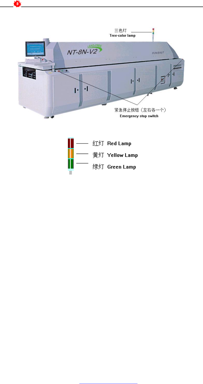 S U N EA ST N T S e r i e s V 2 H o t A i r R e f l o w O p e r a ti o n M a nu a l 8 S UN E A S T TE C HNO L OGY D E V EL O P M E N T Co . , LTD 第三章 系统描述 3.1 主要性能特点 : 3.1.1 加热 系 统 l 增压式 强 制热风 循环 系统, 优 良 的 均温性 和热 效 率 。 l…