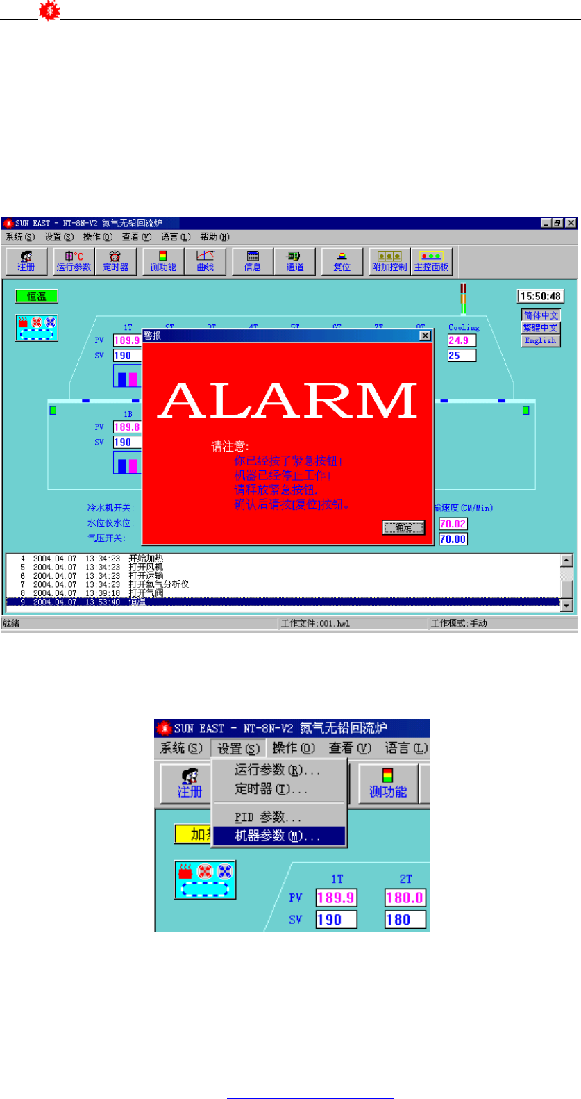 同时蜂鸣器鸣叫报警。此时单击图中[确定],关闭报警对话框和蜂鸣器。待报警内容排除后,