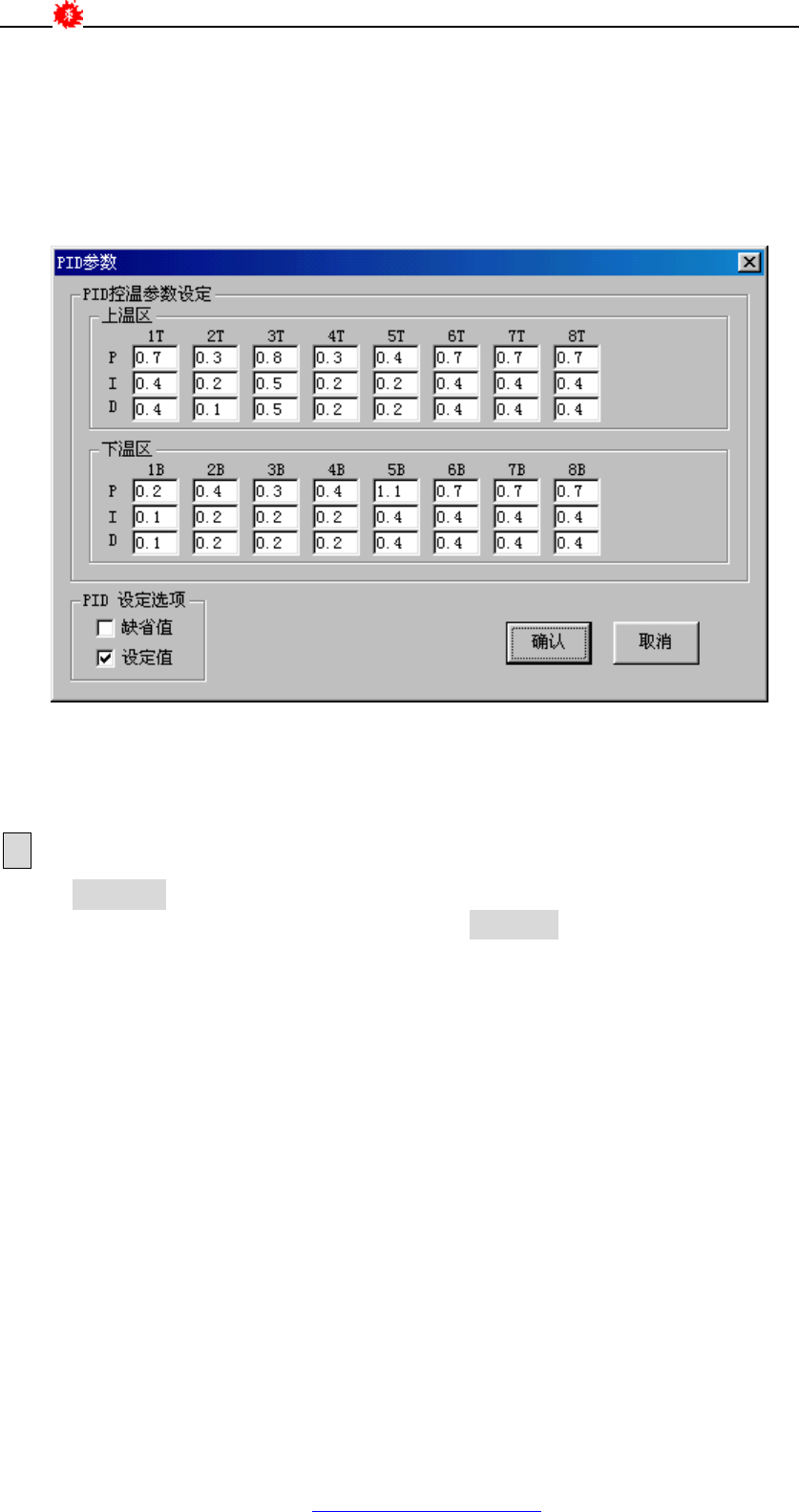 l 若用户将 PID 参数不甚丢失或出错,单击[缺省值],再单击[确认],则 所 有
