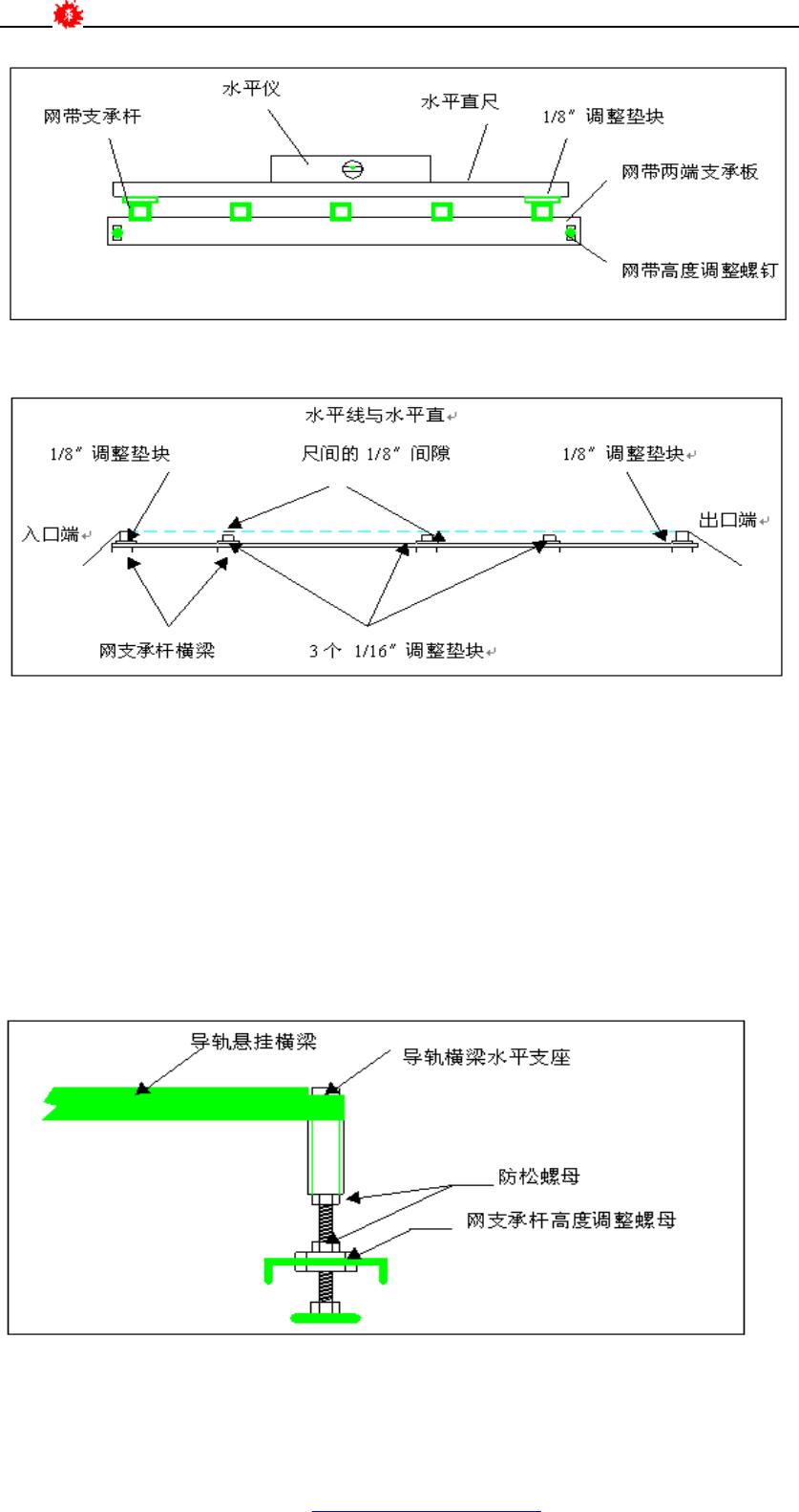 4) 在网带主从动轮水平调整好后,重新安装好网带,调整运输导轨的水平。