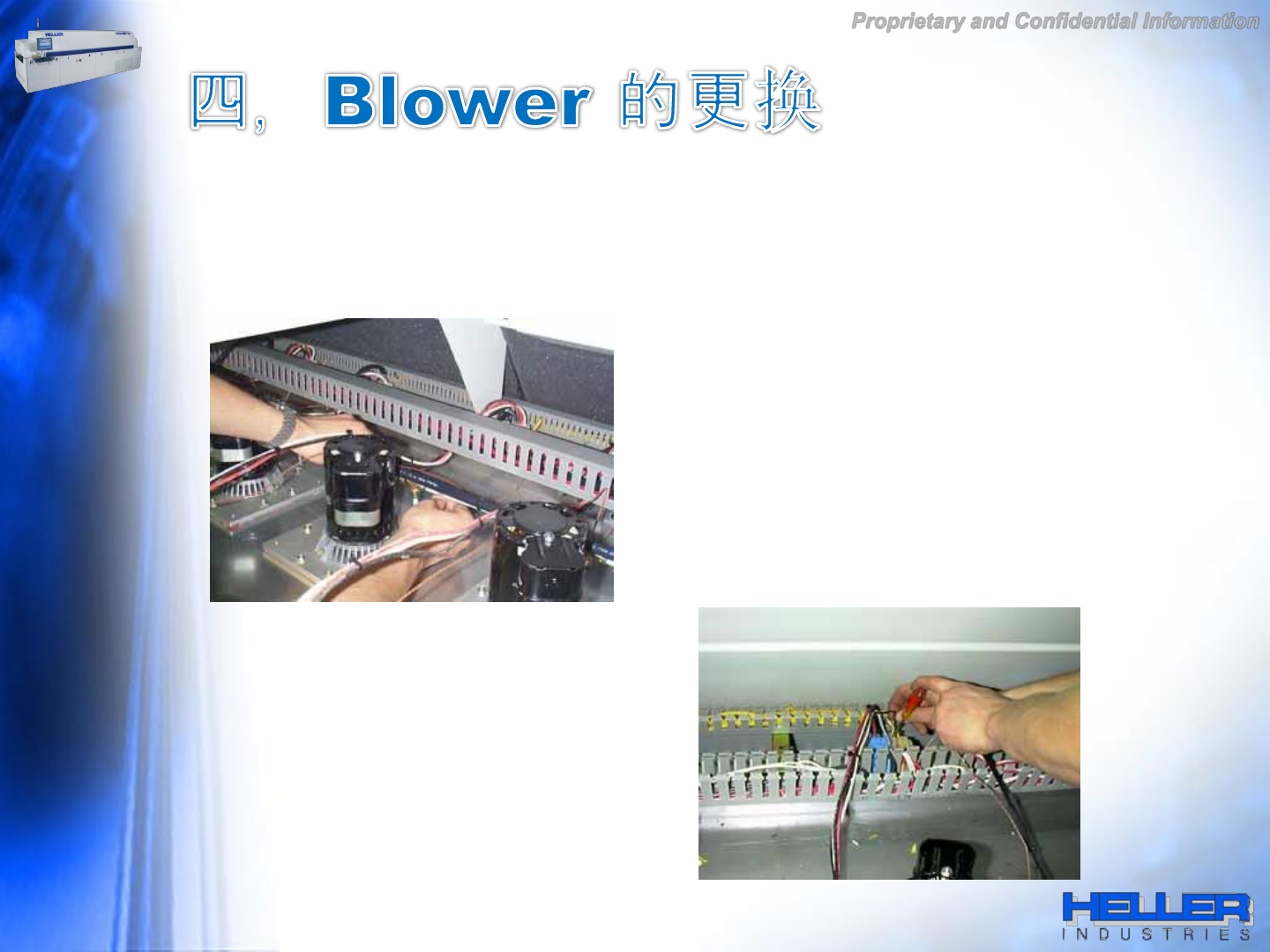 Proprietary and Confidential Information 4. 用 8 号 的扳手移除 Blower 上的 镙丝 , 并 拿掉 垫 片 . 5. 取出 Blower 并 更 换 新的 B lower 在原 来 的位置 ., 并 重新 锁紧 所有的 镙丝 .