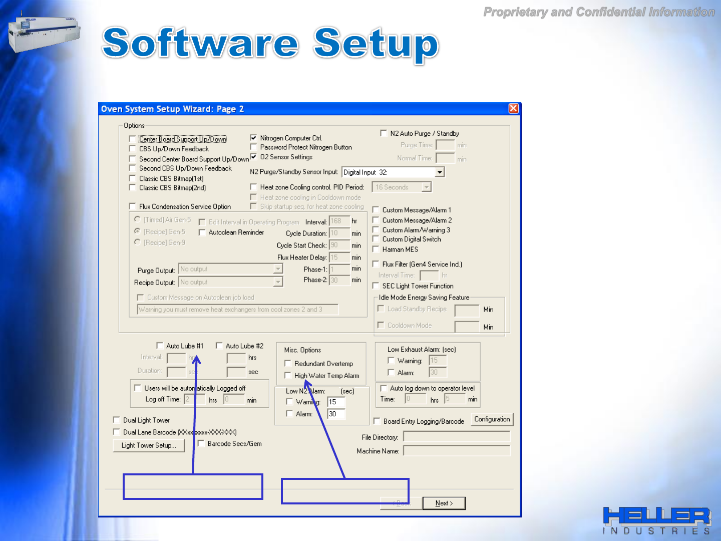 Proprietary and Confidential Information 定 义 回流 炉 的 选项 及其 相 应 的 参数 。 复选 框激 活 软 件 选项 , 编辑 框允 许设 定 参数 。 页 面二 自 动 加油 设 置 高水 温报 警