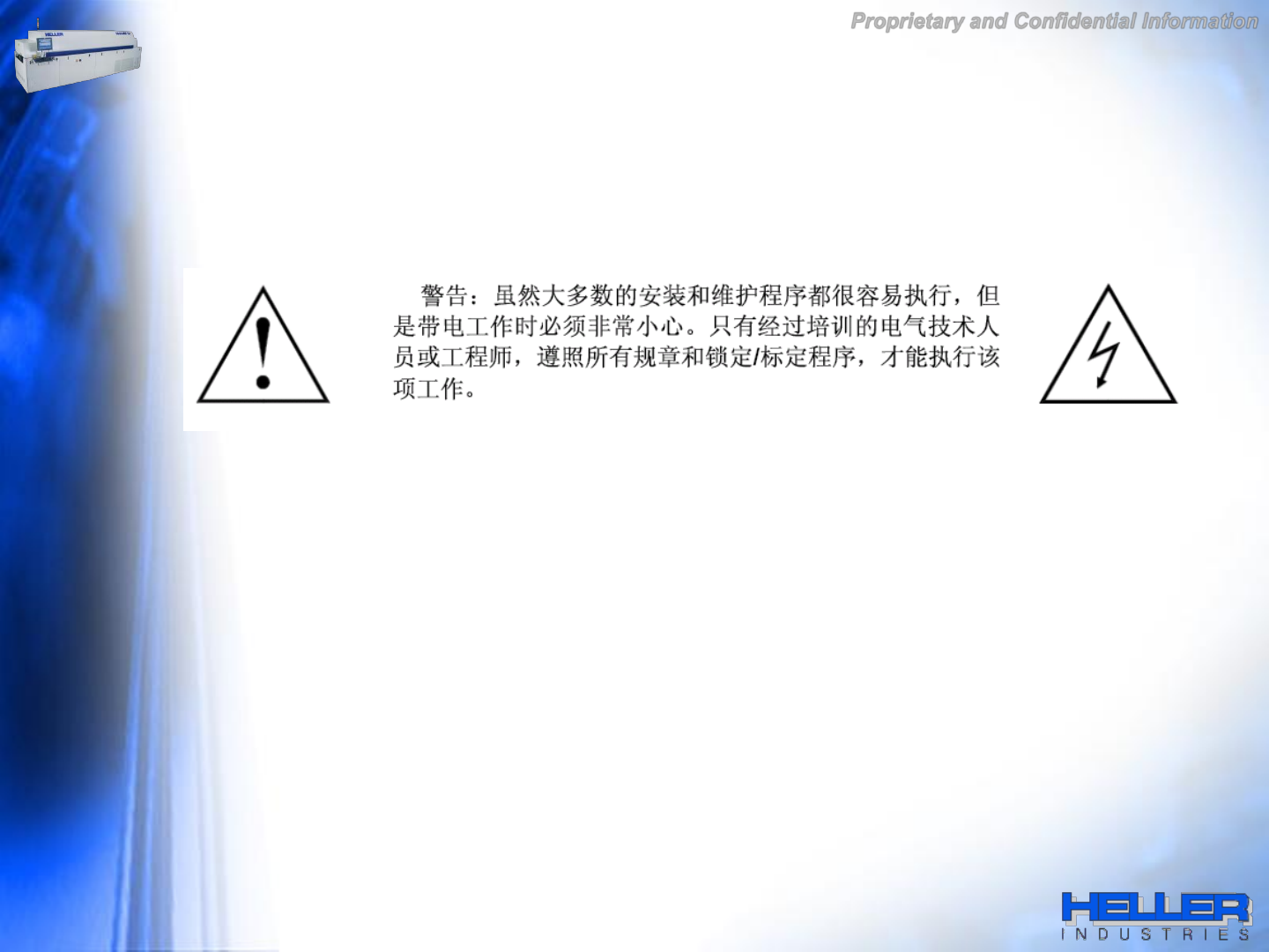 Proprietary and Confidential Information 请 注意 设备 的安全 图标 危 险电压 警告:警告操作人 员 可能引起 严 重 伤 害甚至死亡的高 压区 域的位置。 灼 热 表面警告:警告操作人 员 接 触时 可能引 起 烫伤 的灼 热 表面。 移 动 部件警告:警告操作人 员 保持手部和手指 远 离可能引起 伤 害的机 构 。