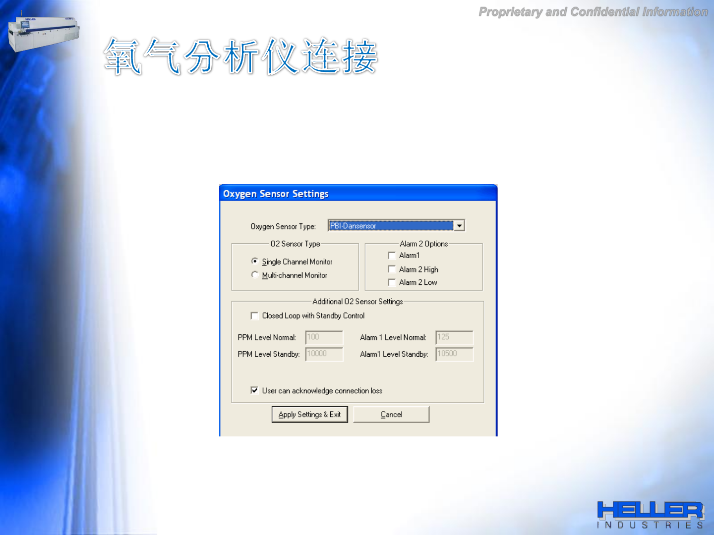 Proprietary and Confidential Information 首先在 Ov en 软 件 氧气 分析 仪设 置 选项 中 选择 相 对应 的 氧气 分析 仪 的型 号 。 PBI 品牌的 氧气 分析 仪 , 请选择 “PBI Dansensor” , 然后 选择 单 通道;如果有 PPM 的 监 控,需要勾 选 “ Alar m1” 。如下 图 :