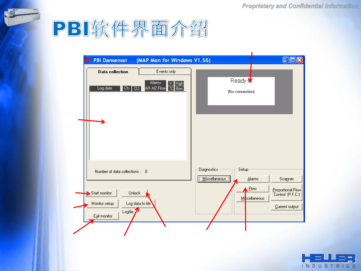 Proprietary and Confidential Information PBI 软 件 开 始 运 行是, 氧气 分析 仪 有一 个预热过 程,一般大 约 是 18 分 钟 。只有 当预热 完成, 氧气 分析 仪 才能 开 始工作。 这时氧气 分析 仪 中 的加 热 模 块温 度大 约 是 760 ⁰C 左右。如下是 开环 控制 单 通道 氧气 分析 仪 的 连 接示意 图 。