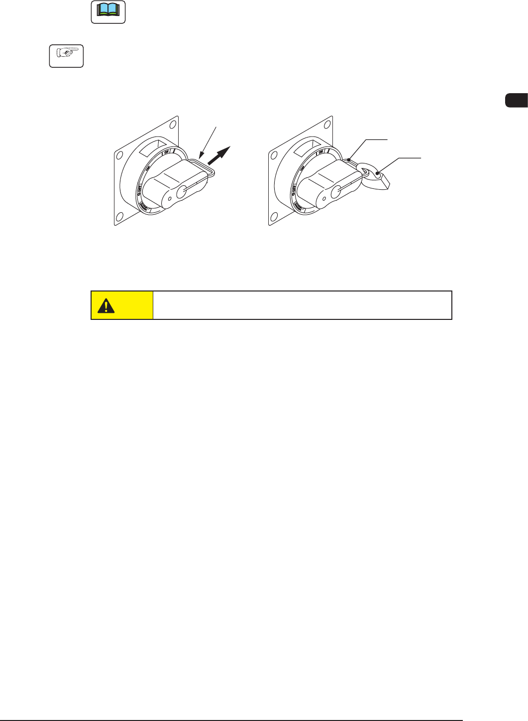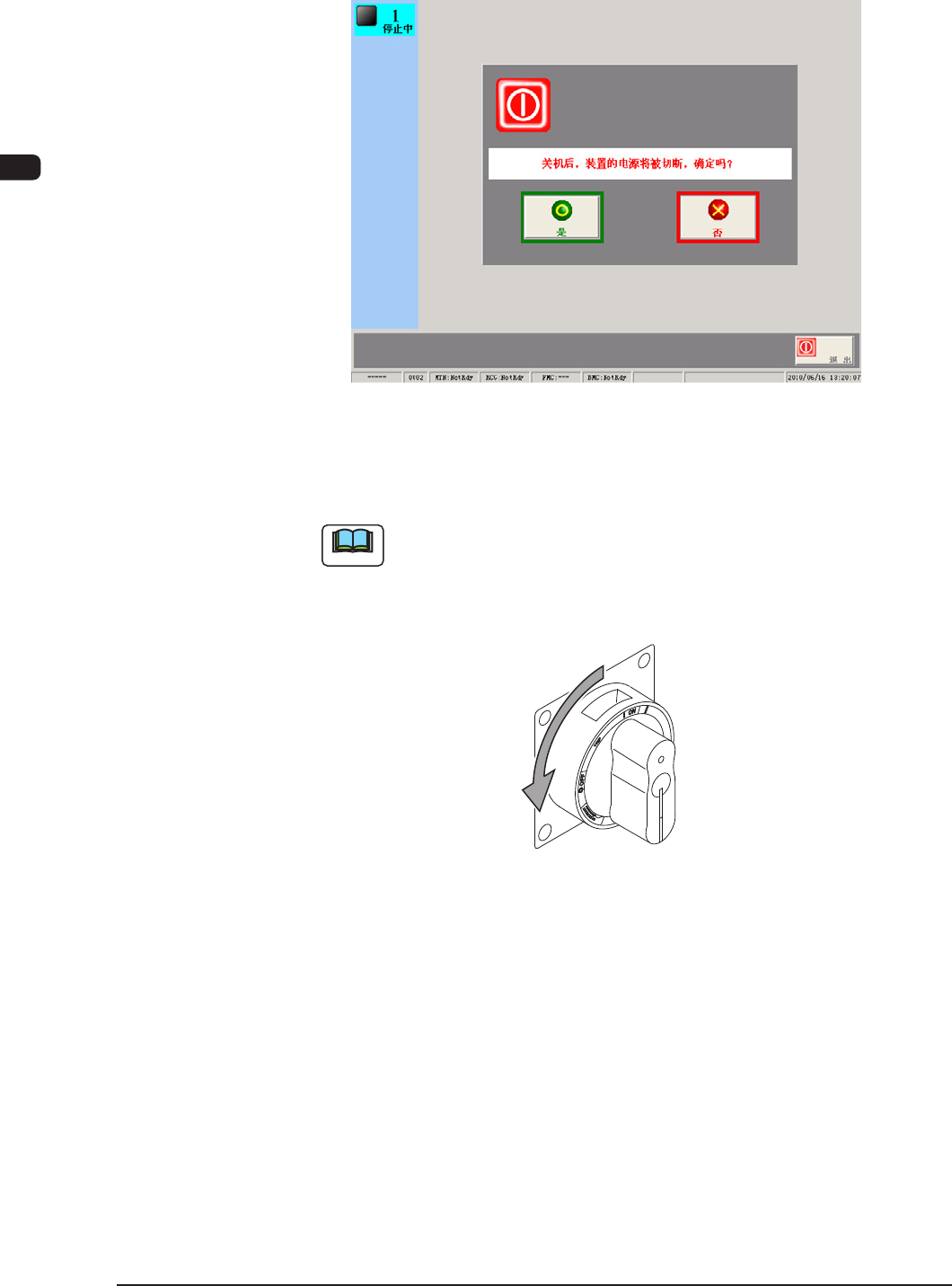 1OM-1602 2-19 第二章 4. 结 束 1008-001 4.3 电闸的锁定 Note 长期不使用装置时,请锁上电闸。 Procedure (1) 将电闸的锁环按下图 A 方向拉出。 ( 一旦从锁环上松手,锁环就会复位,因此请不要松开手。) (2) 在锁孔上锁。 锁环 A 锁环 挂锁 电闸的锁定 F1B16 注意 挂锁的钥匙由维修人员管理,禁止非维修人员随意动用。