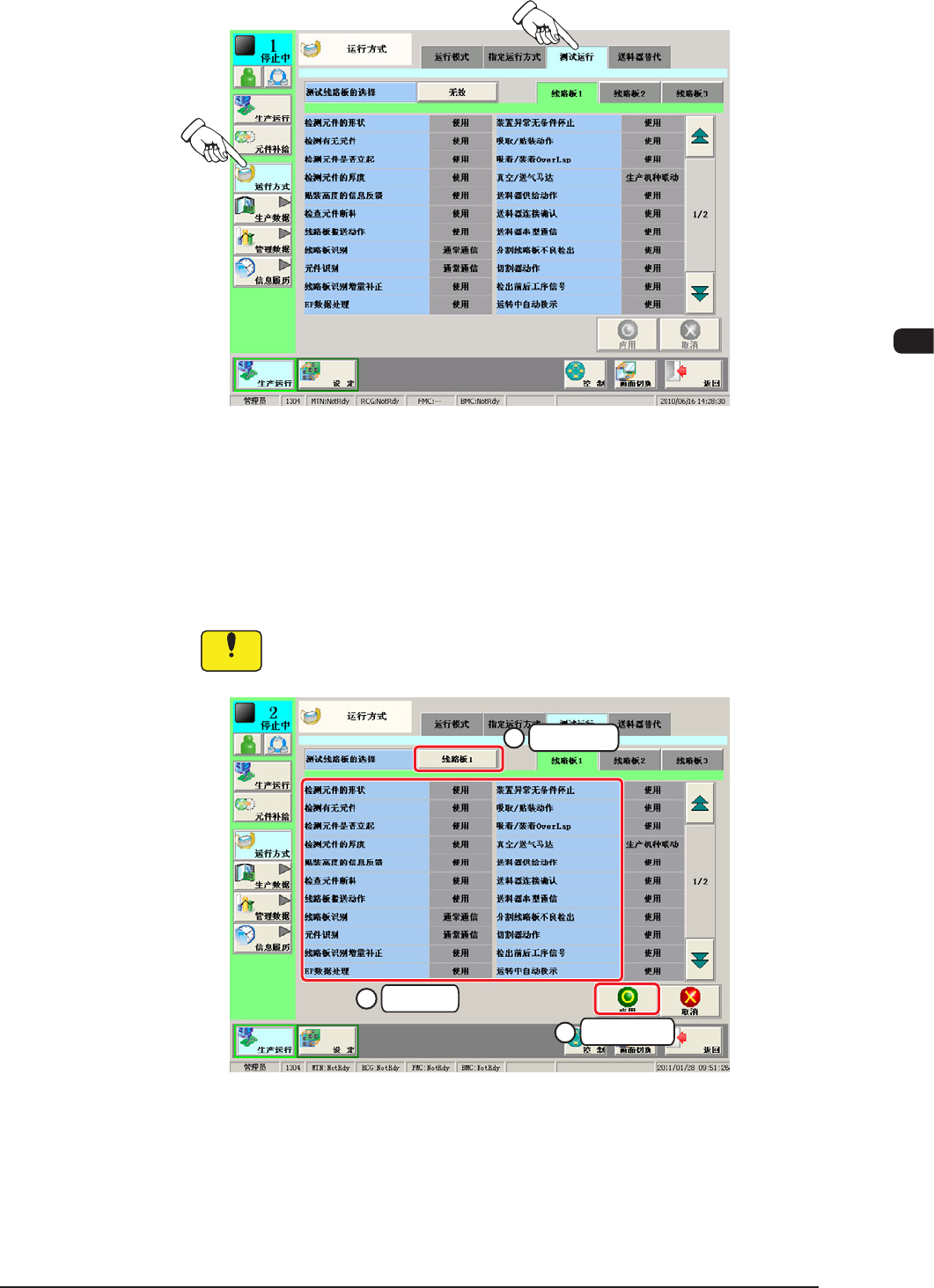 若弄错测试运行方式的选择,就会引起吸嘴的元件吸取、元件散乱或