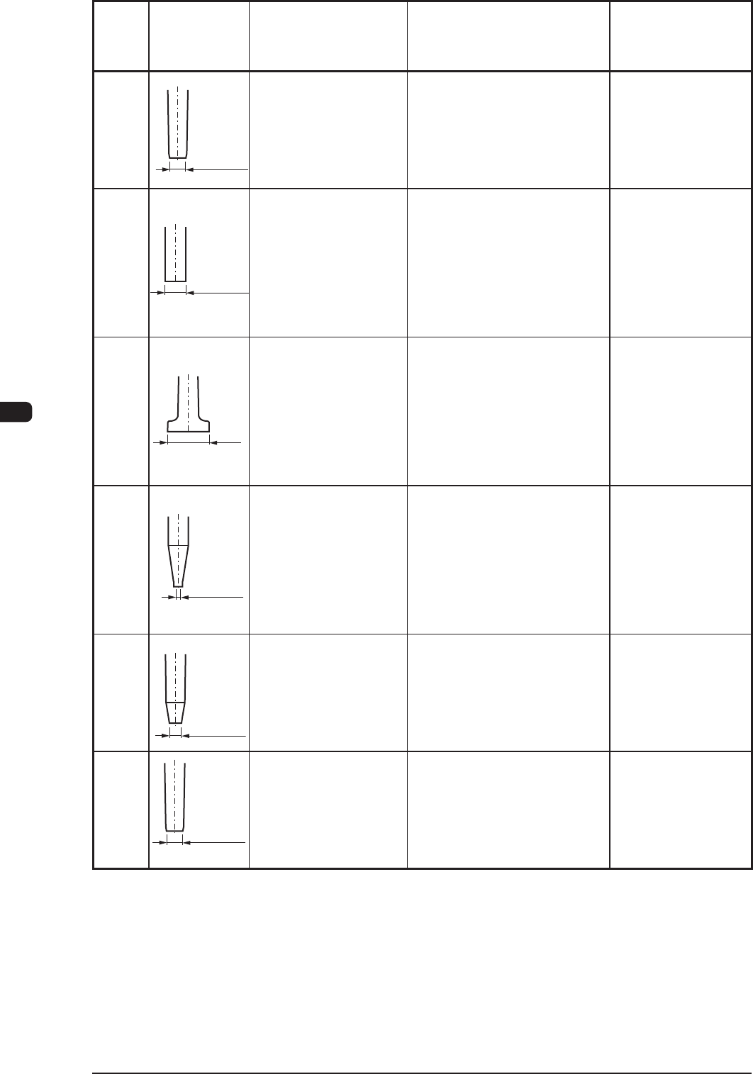 1OM-1602 4-18 第四章 5. 吸嘴类型一览表 1 103-003 吸嘴 类型 NO. 形 状 Note a 片状软件的大小 (mm) Note b 适用参考元件 备 注 HA14C 内径 φ 1.1 外径 φ 1.8 2.5 × 1.6 ~ 4.0 × 3.0 厚度 0.45 ~ 2.5 3216/3225 类型的 电容器和电阻器、 钽电容器 A、 超微型晶体管 • 反射识别用吸嘴 HA14C--- NOZZLE_HA14C…