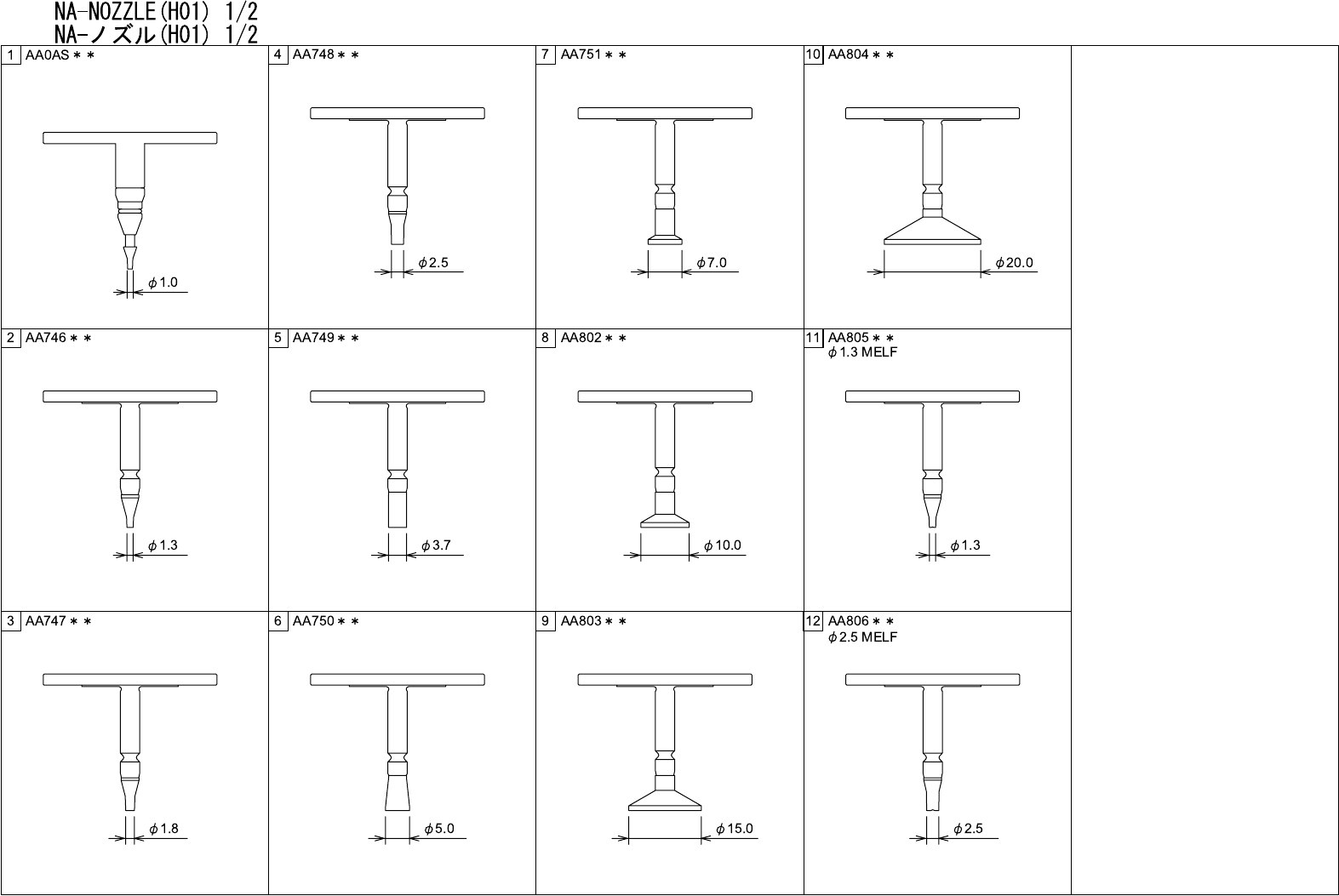 NA-NOZZLE(H01) 1/2 NA-ノズル(H01) 1/2 番号 図番 & コード番号 個数 品名 規格 材質 備考 No. Drg.No. & Code No. QTY Description Rating Materials Remarks 1 AA0AS** 1 NOZZLE ノズル OT φ1.0 2 AA746** 1 NOZZLE ノズル OT φ1.3 3 AA747** 1 NOZZLE …