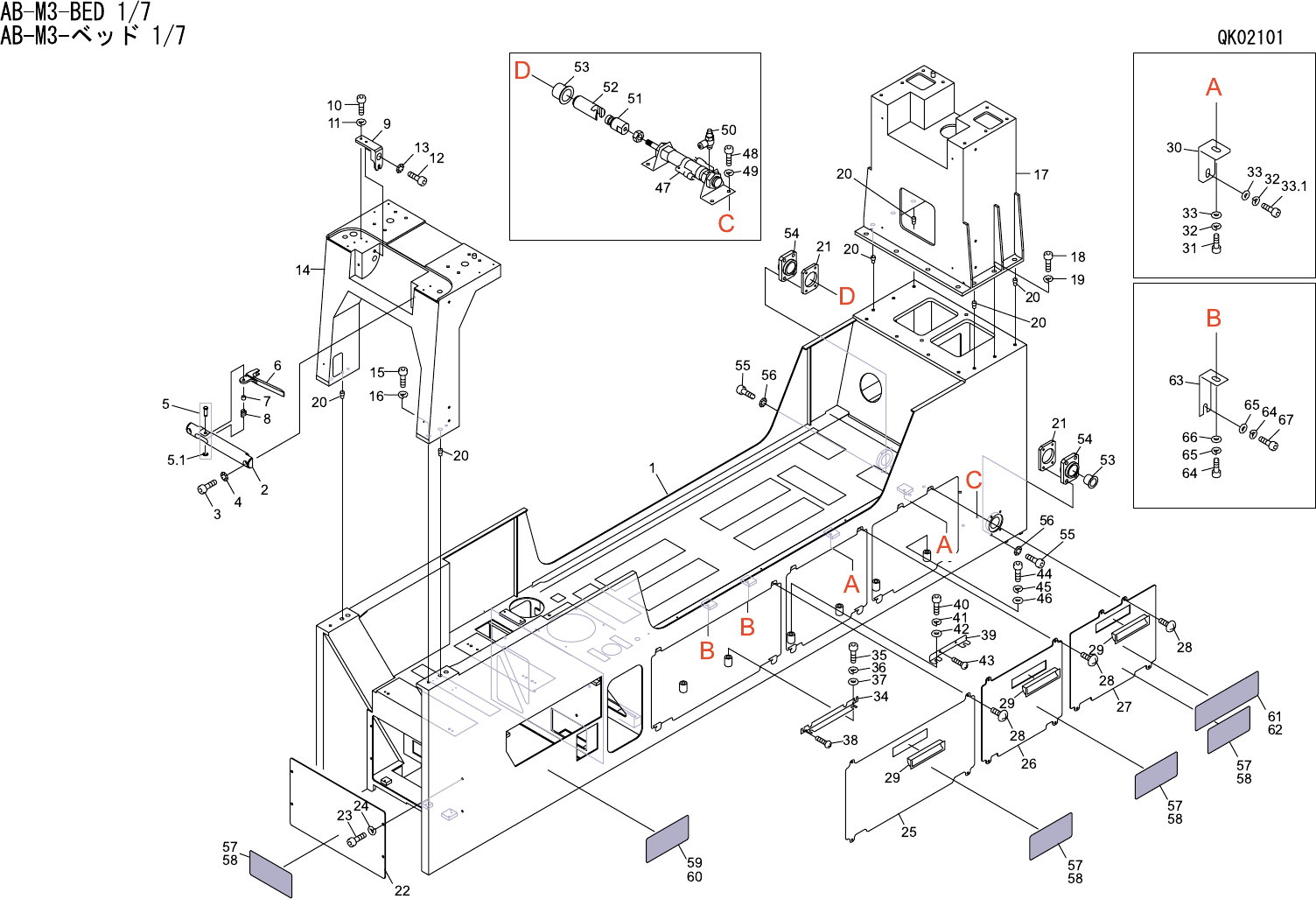 AB-M3-BED 1/7 AB-M3-ベッド 1/7 QK02101 番号 図番 & コード番号 個数 品名 規格 材質 備考 No. Drg.No. & Code No. QTY Description Rating Materials Remarks 1 PM19747 1 BED ベッド FE 2 PM00101 1 BKT BKT FE 3 H5322A 2 BOLT, HEX SOCKET ボルト 六角穴 …