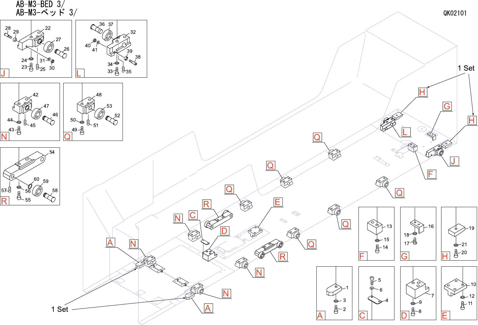 AB-M3-BED 3/ AB-M3-ベッド 3/ QK02101 番号 図番 & コード番号 個数 品名 規格 材質 備考 No. Drg.No. & Code No. QTY Description Rating Materials Remarks 1 PM00751 1set BLOCK ブロック FE 注1 Note.1 2 H5298A 2 BOLT, HEX SOCKET ボルト 六角穴 M05X010 1…