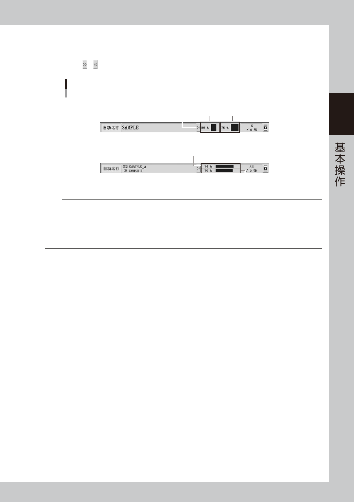 2-10 2 ■ 各种按钮和输入框 操作画面上设置有各种按钮、选项卡、输入框等。 1 1 2 3 4 6 操作画面 以“标记”画面为例 参数列表 数据No.列表 5 7 [编辑]按钮 26202-KMK-00 1. 滚动条与滚动按钮 ( 纵、横 ) 查阅数据 No. 列表、参数列表时,当前画面无法完全显示所有项目时使用。 2. 操作按钮 根据目的,打开下一操作画面和对话框时使用。 3. 行移动按钮 查阅数据 No. 列表、参数列表时,逐…