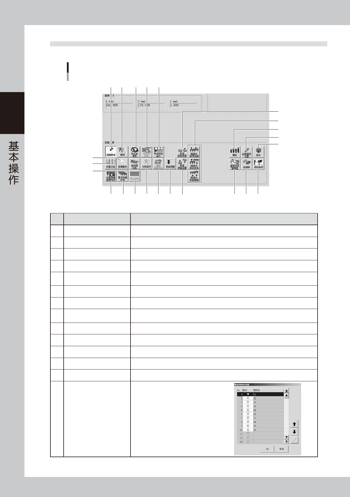 2-12 2 2.2 “生产设计”画面 下面,介绍“生产设计”画面中各个按钮的功能。 “生产设计”画面 18 16 19 20 23 22 21 3 4 9 10 11 8 12 7 6 17 15 5 1 2 13 14 26204-KMK-00 按钮名 功能 1 返回原点 使 W 轴以外的所有轴返回原点位置。 2 暖机 进行暖机运行。还可以指定在任意时间进行暖机。 3 作业后停机 使贴装后的基板被传出到下游机之前,停止贴片机的运行。…