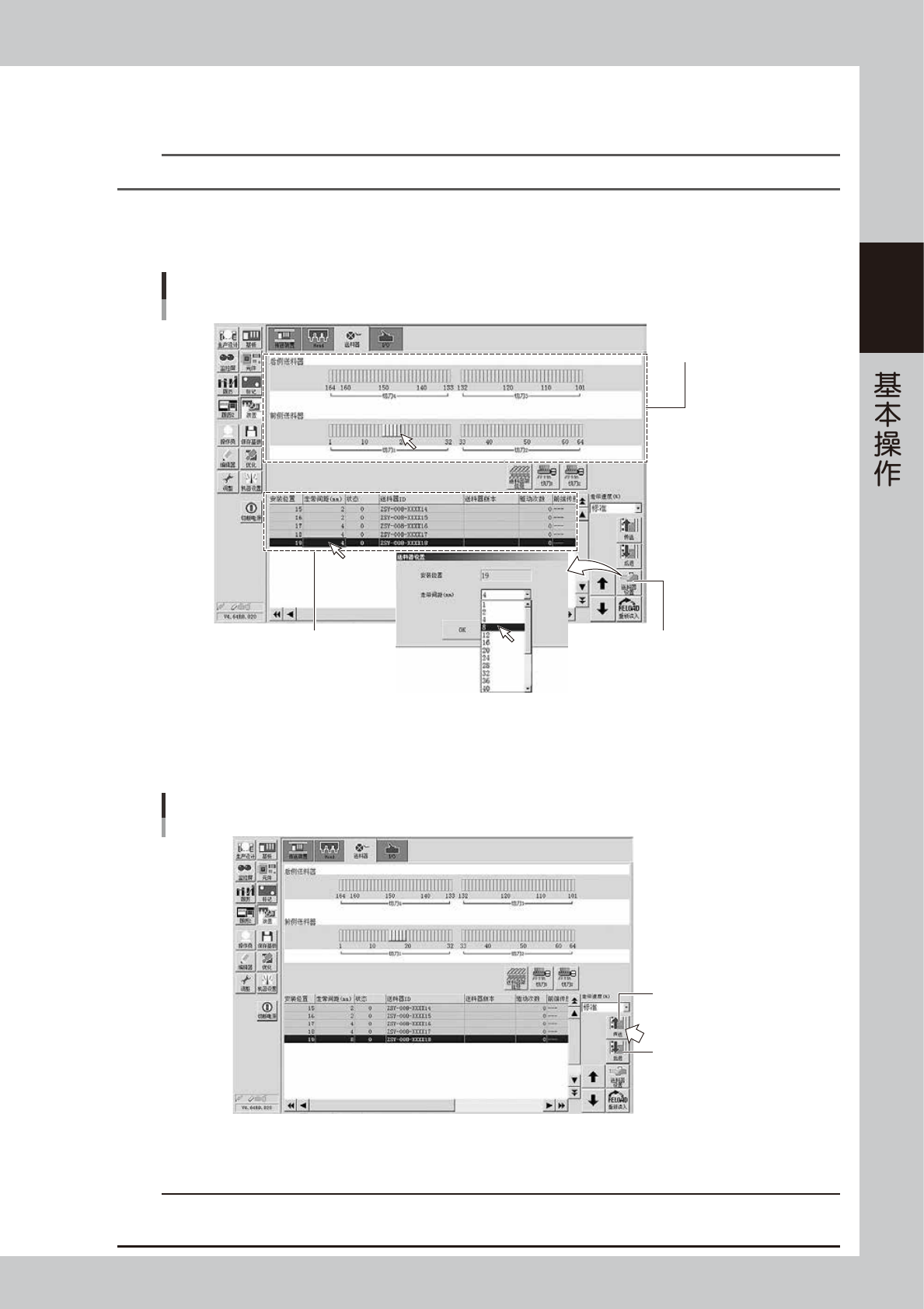 2-59 2 5 打开送料器设置画面。 选择需要设定走带间距的送料器,按 [ 送料器设置 ] 按钮。 参考 可从送料器安装示意图或送料器列表中选择。 6 设定走带间距。 从下拉框中选择适合所安装元件用的间距,按 [OK] 按钮。 设定走带间距 [装置] -“送料器”-“送料器设置”画面 送料器列表 [送料器设置]按钮 送料器安装示意图 26232-KMK-00 7 确认走带状态。 按画面右下方的 [ 传送 ] 按钮,确认料带是否按设定的…
