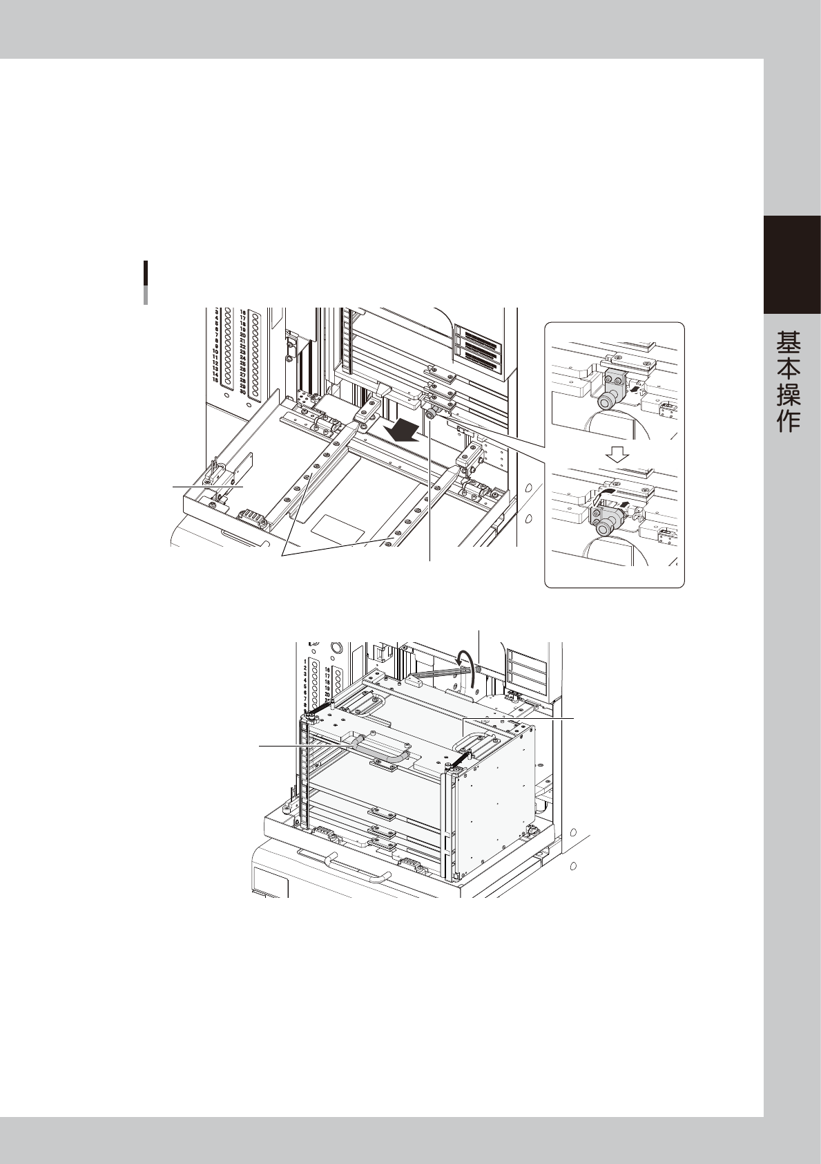2-75 2 3 打开柜门。 将柜门把手向自己一侧拉开,打开柜门。 4 抽出载料箱。 1. 如下图所示,拉住载料箱锁杆并向左旋转解除载料箱的锁定状态。 2. 把住载料箱上侧的把手,沿导轨拉出载料箱。 3. 为防止载盘滑落,将防止载盘滑落的止动杆插入载料箱下侧圆孔中。 4. 双手把住搬动用的把手,将载料箱从导轨上搬下。 载料箱抽出用把手 防止载盘滑落用止动杆 搬动用把手 柜门 抽出载料箱 导轨 向左旋转之后退回锁杆 载料箱锁杆 解除锁定 …