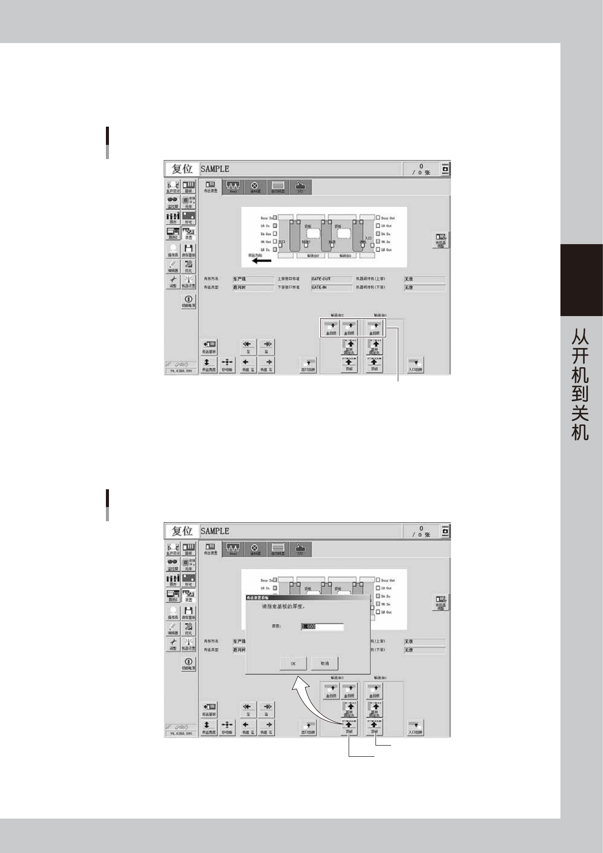 3. 双段输送台机型时,需使输送台 1、输送台 2 的顶板都上升。