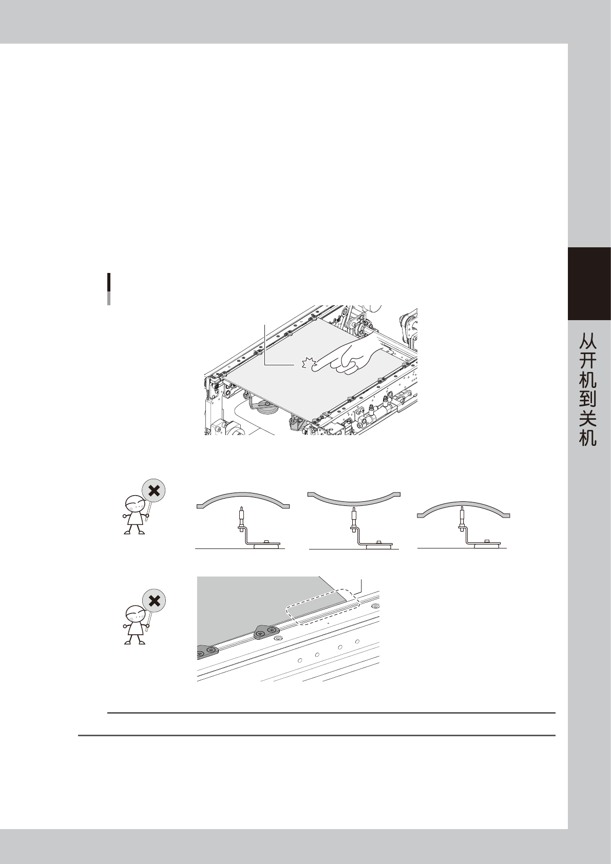 3-15 3 1.6.3 确认基板的固定状态 1 传入基板。 参照本章前述 “1.6.2 调整基板压板” 中 Step1 的步骤传入基板。 2 e 确认基板的固定状态。 1. 按急停按钮之后,打开贴片机的机盖。 2. 使用一次性换料车的机型,为便于操作需将料车从贴片机上拆下。 3. 用手指在基板上数处轻敲,从侧面目视检查基板,确认基板已被顶针均匀支撑。 4. 从侧面目视检查基板,确认基板无向上或向下挠曲。 5. 尤其是基板左右边端附近,…