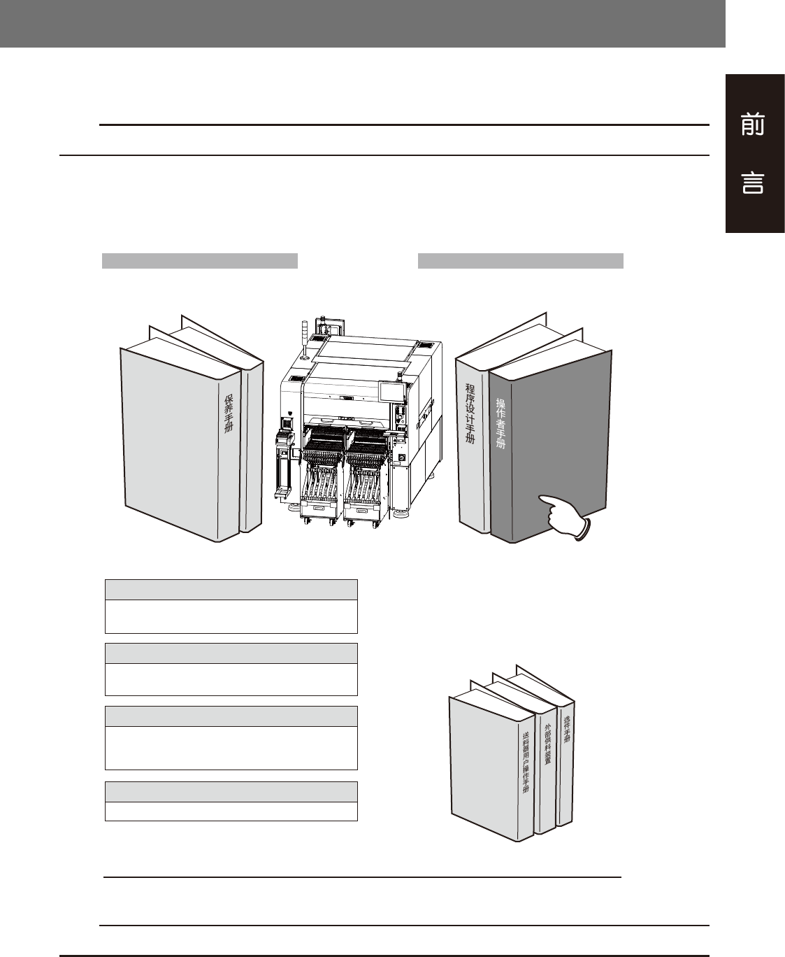 ii 2. 各章内容 本书由下述各章组成。 安全须知 介绍使用本设备必须注意的安全方面的内容。 前言 第 1 章 各部的名称与功能 介绍各部的名称、功能等操作前的必知事项。 第 2 章 基本操作 · 介绍操作本设备时需使用的各种按钮的使用方法以及各操作画面的内容。 · 介绍将元件安装在带式送料器与将带式送料器安装到贴片机上的方法。 · 介绍托盘供料装置 ( 选配 ) 的操作画面与元件的安装方法。 · 介绍具有代表性…
