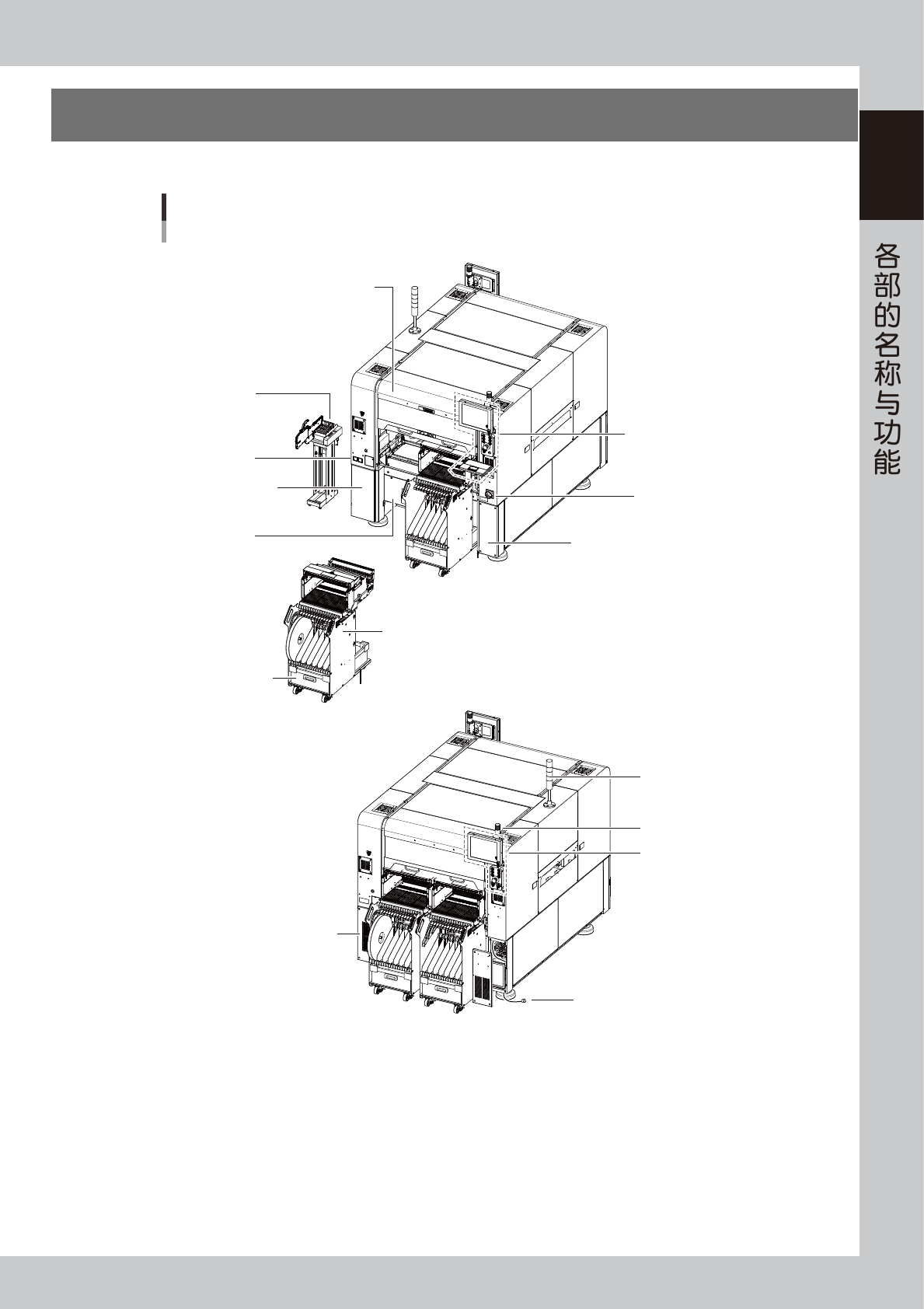 本节,介绍贴片机主要部分的名称与功能。安装完毕的标准贴片机的构成,如下图所示。