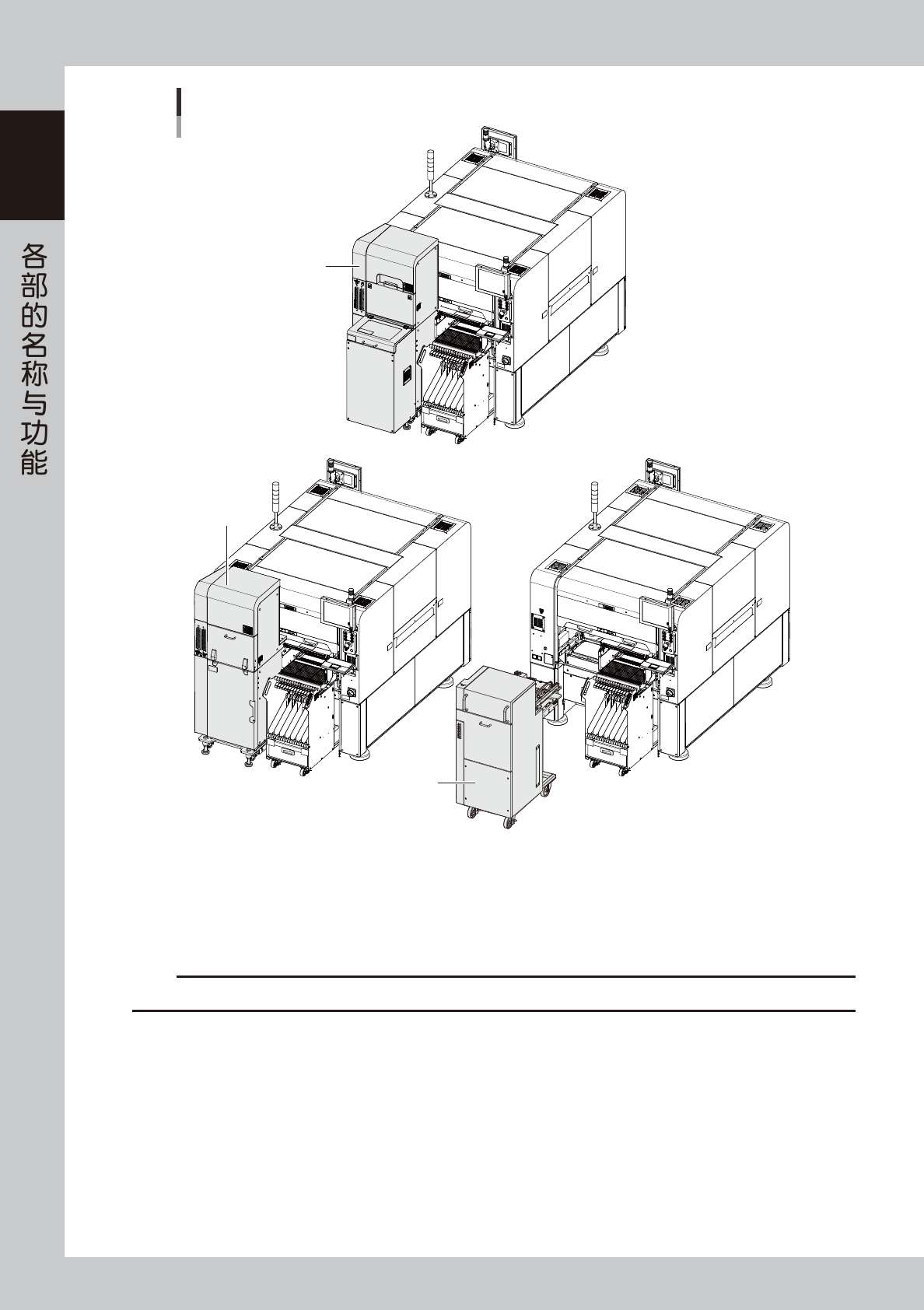 1-1 1 1. 贴片机主体 本节,介绍贴片机主要部分的名称与功能。安装完毕的标准贴片机的构成,如下图所示。 ■ 安全机盖 ● 正面 ● 背面 □ 上料台 ■ 操作、输入部 (键盘为可选配置) ■ 多层信号灯 ■ 电源主控开关 □ 切带器 (盖板内部) 贴片机主体 以一次性换料车机型为例 ■ 气压表 ■ 气源连接部 □ 送料器用一次性换料车 ■ 机器间输入、输出用接口 (盖板内部) ■ 机器间输入、输出用接口 ■ :标准配置 □ …
