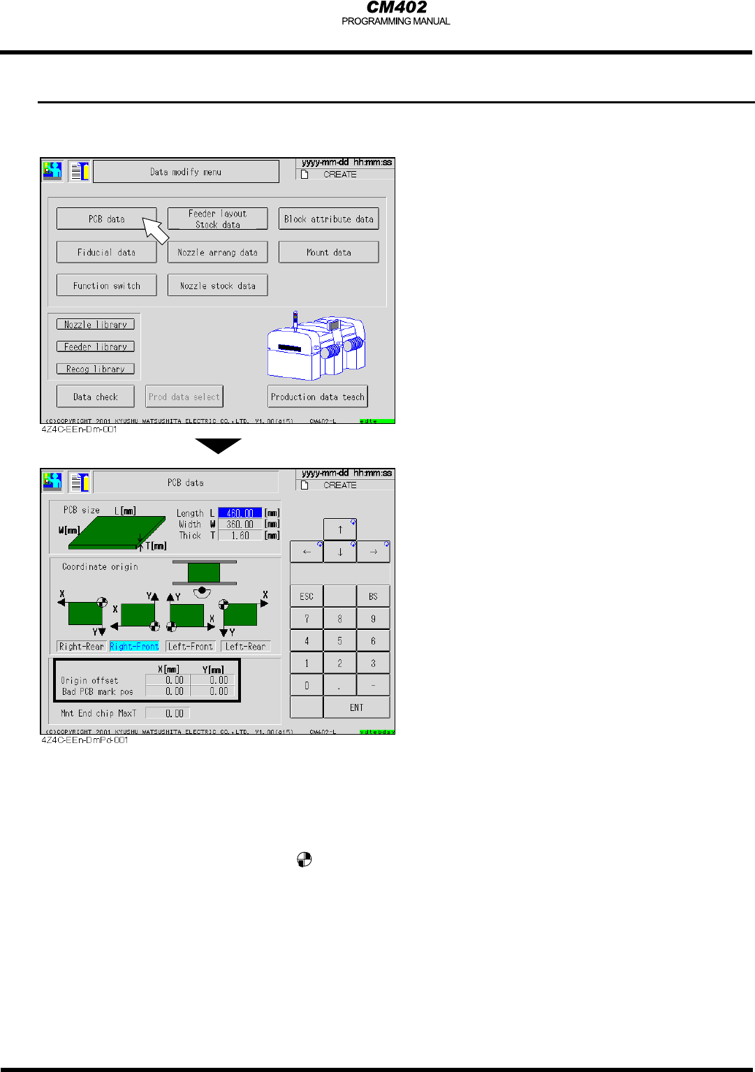 從機器前面看,原點標記 的位置即為裝著座標、電路板識別座標及壞電路板標記座標的原點(0,0)