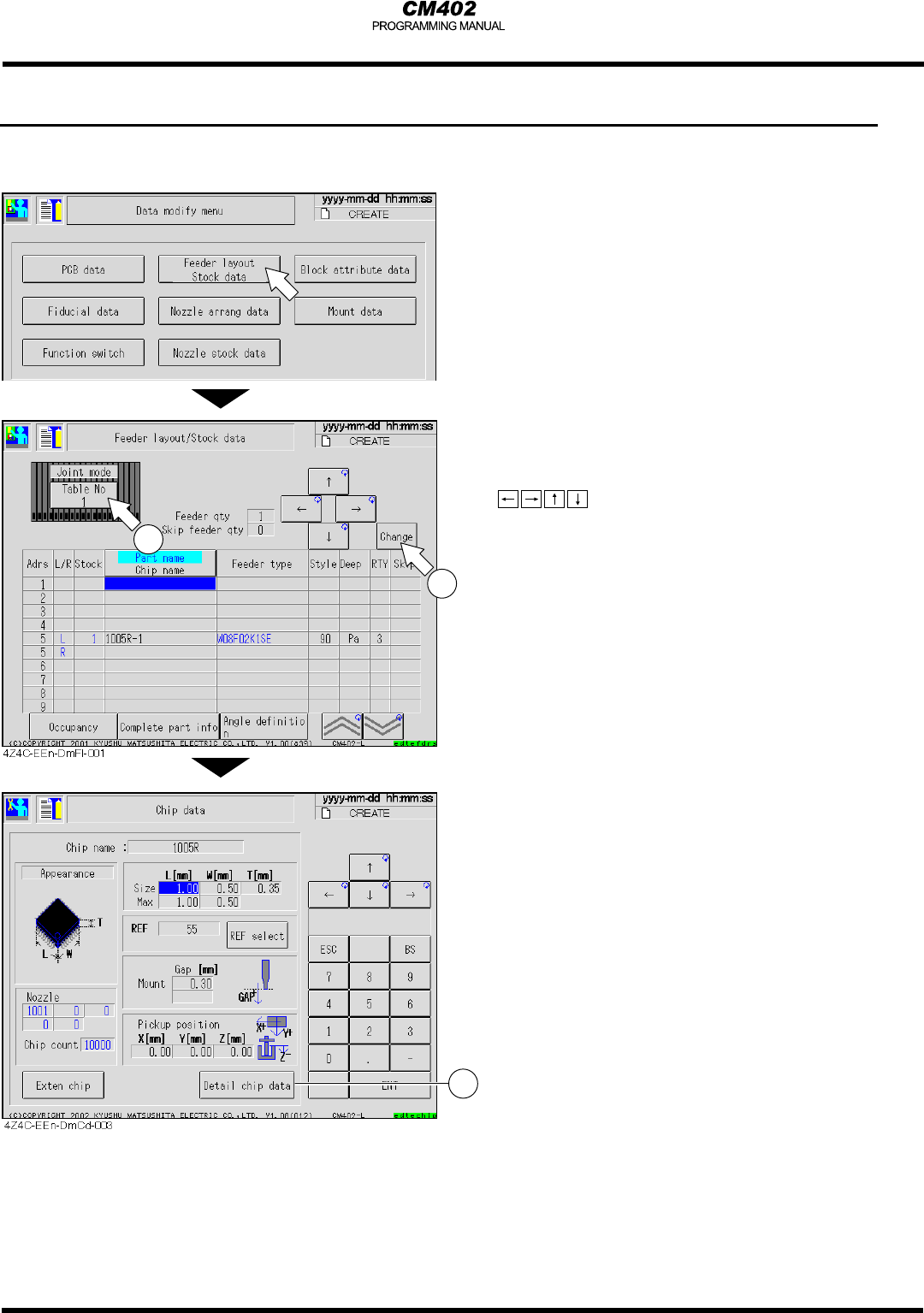 Page 5 -5 5.4 料架配置及庫存資料 可從同時顯示的料架配置表及庫存資料清單上,檢查料架台上的料架配置狀況,並可檢查及修改使用的 零件資料 1. 按下 [Fe e der l a y out / Stock d a t a ]. • 顯示 <feeder layout / Stock data> 畫面 2. 選擇欲檢查的料架台 3. 資料修改 • 只能修改包裝、深度及零件名稱 ∗ 如何修改零件名稱 (請參7-5零件…