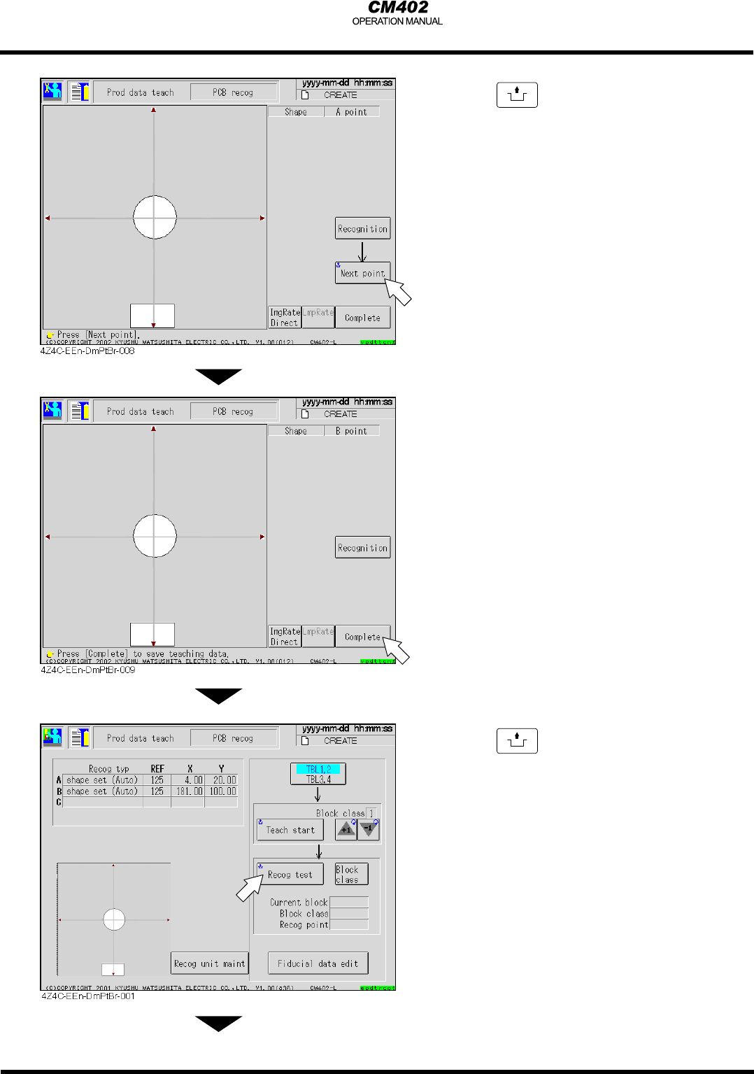 Pa g e 6 -4 5. 按下 UNLOCK → S T A R T 兩按鈕在操作面板上 6. 在軌道的前方放置一塊基板 7. 選擇 "TBL 1,2" 8. 按下 UNLOCK + 點選 [ T e a ch s t a r t]. • 基 板 導入 • 開始自動辨識 • 自動儲存資料 9. 點選 [ C o m p l e t e] • 資料自動儲存 到下一頁 3Y3C-086P 3Y3C-086P 1 2
