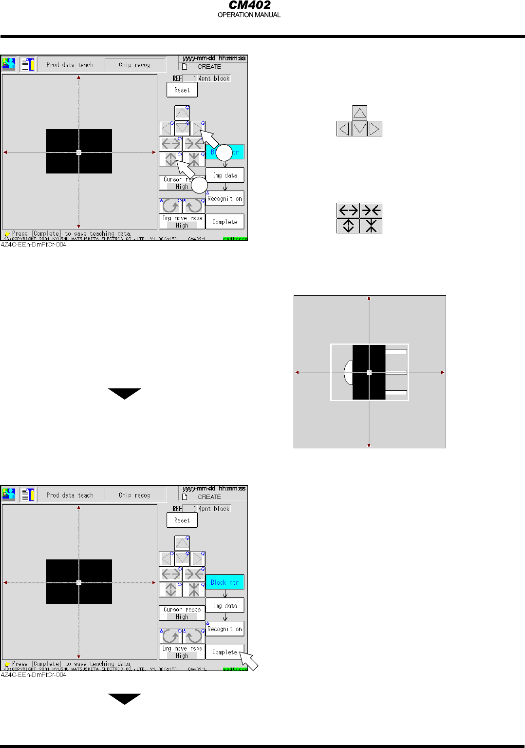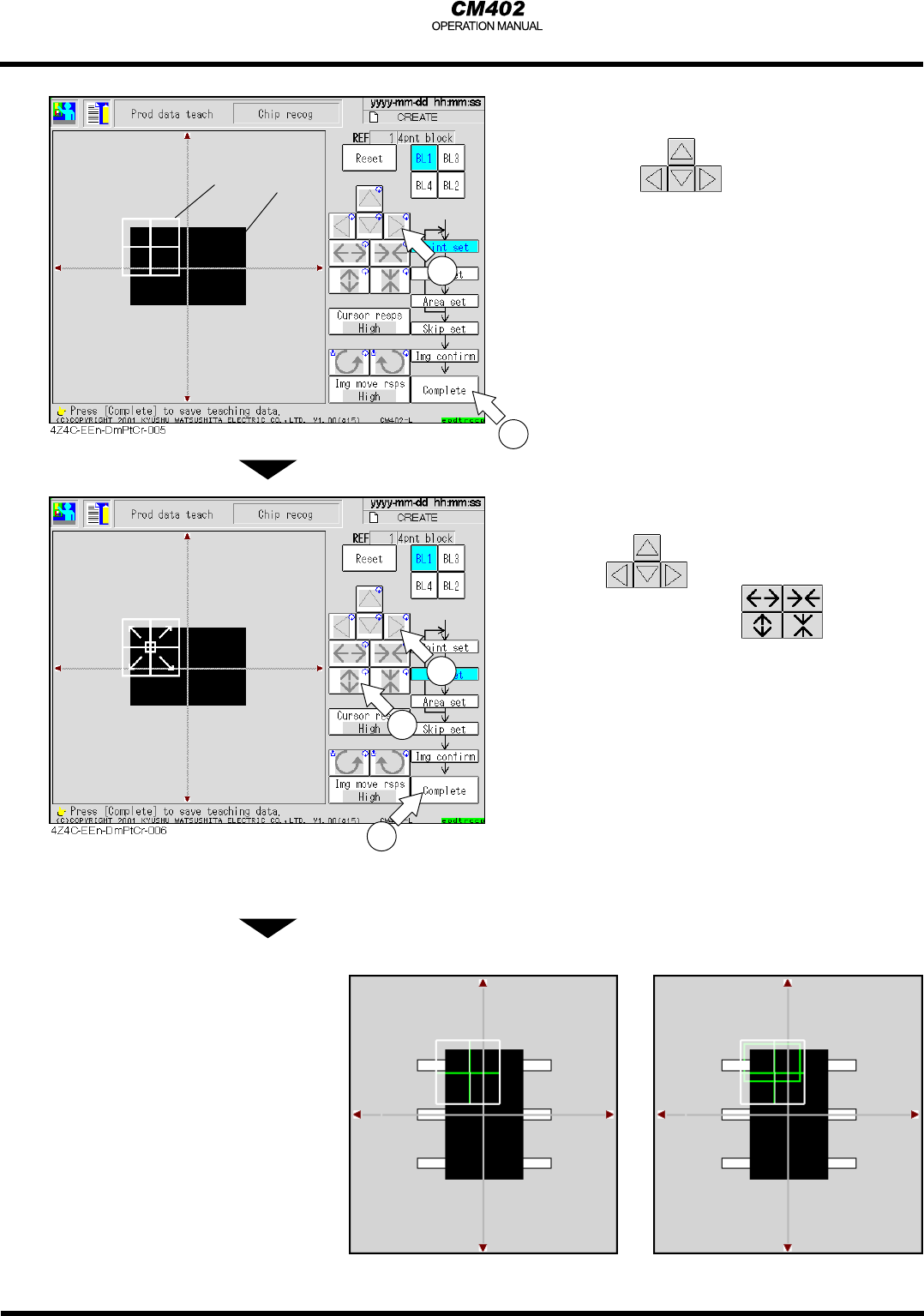 P a ge 6 -11 11. 設定在 BL1上要辨識的位置 • 可點選 使其移動 將零件(顯示為黑色)置於辨識位 置內使其佔全部的70% ((a) : 辨識位置 , (b): 零件 ) 12. 點選 [ C o m p l e t e] ∗ 同樣地對於有腳的零件,設定其顯 示為黑色的部位佔全部的70% (如下方的 辨識圖一) 13. 設定要在 BL1辨識的圖像的範圍 • 點選 移動在要 辨識位置 內部的框架,然後點選 調整其大小 .…