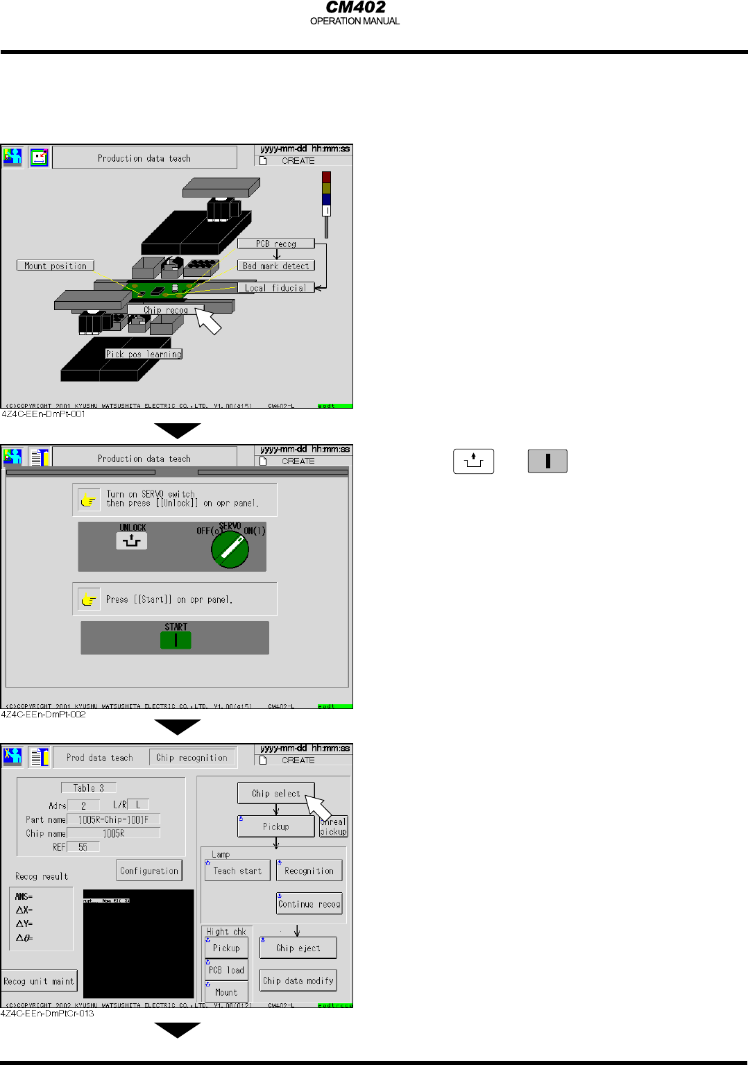 P a ge 6 -9 4. 選擇要辨識的零件 ∗ 選擇料架平台後,點選零件名稱 進行教示 5. 按住 UNLOCK + 點選 [Pick u p] • 吸起零件並移動到辨識位置 6. 按住 UNLOCK + 點選 [ T e a ch s t a r t] • 辨識畫面放大,開始教示 7. 校準零件的吸著位置使其位於 區塊中心 • UNLOCK + 可以修正角度,及 UNLOCK + 可移動零件圖像 ∗ 假如零件中心點與吸著位置不一致…