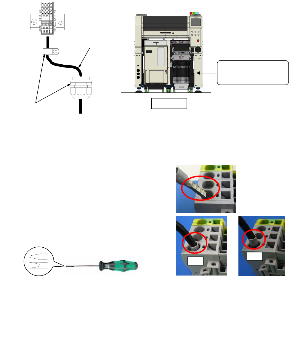 NPM-TT2 2019.1015 - 133 - 12. ・ 电源 空气投入部 12.1 电源投入部 ■ 电源使用 4 芯电缆,是 3.5 mm 2 ~ 5.5 mm 2 范围的电缆,并且使用专用工具进行 连接。 ■ 如下图所示,请采用在 2 处夹钳电缆的方法进行配线。 1. 电缆外经尺寸 : φ 13.5 mm ~ φ 18.0 mm 2. 请必须用电缆夹具固定电缆,不使其 被拖拉 (100 N) , 转动而发生移动。 ■ 端子台连…