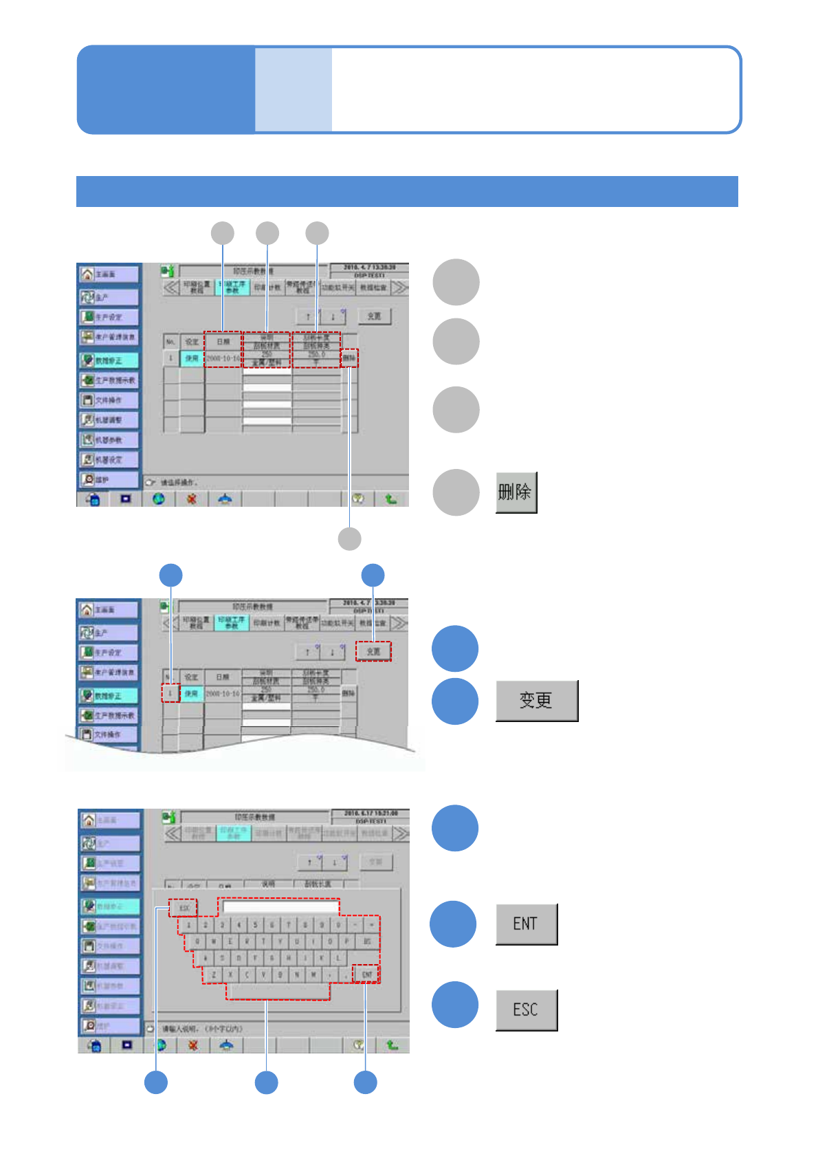 SPG EJP6AC-MB-0 4OM-02 生产数据 编辑 印刷工程参数的编辑 6 操作篇 4-1-9 4-1-9 -11 1 选择刮刀 No. 2 2 1 3 输入说明内容 4 ■修改说明内容时 在「印压示教数据」画面进行编辑 日期 进行印压示教的日期。 说明/刮板材质 区分不同材料的刮刀的说明 和刮刀的材料。 删除相同行的印压示教数据。 刮板长度/刮板种类 刮刀的长度和种类。 ●长度和种类即使相同 , 也可以登录不同材料。 A B…
