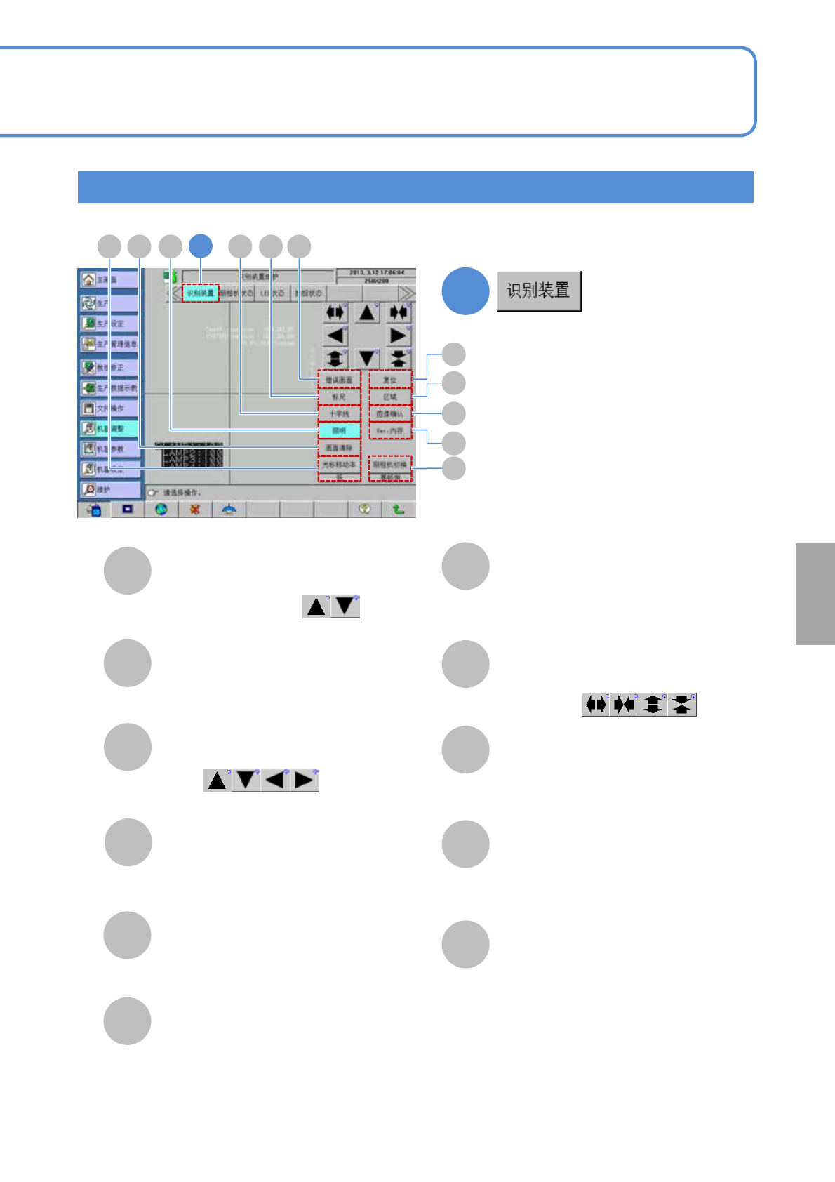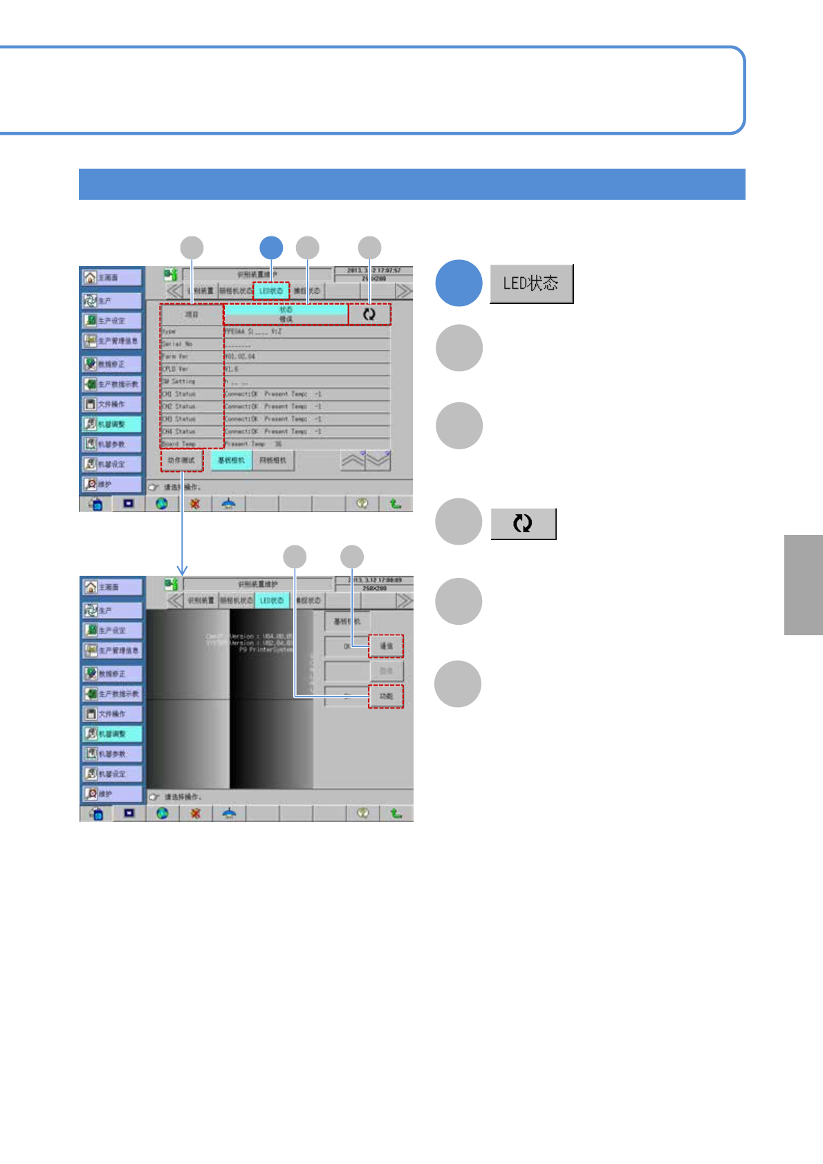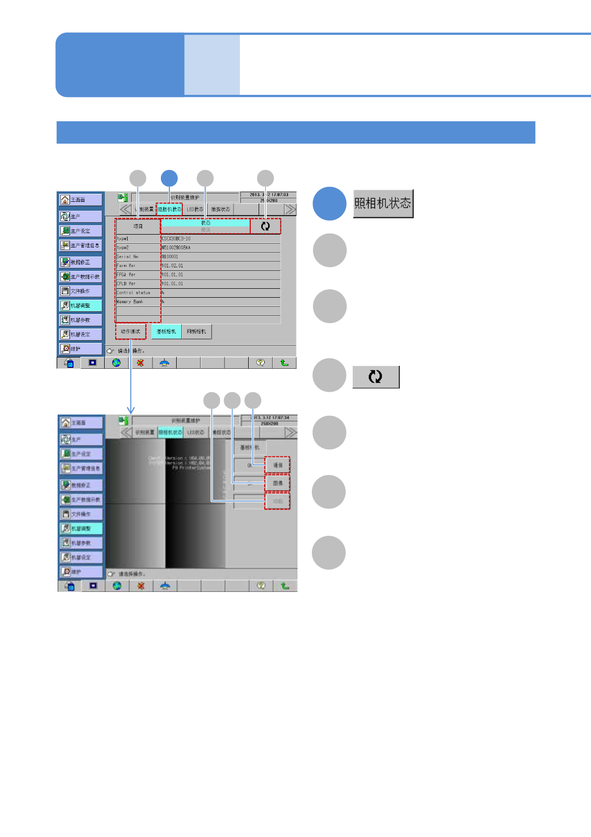 SPG EJP6AJ-MB-05OM-03 机器 调整 识别装置的维护 2 操作篇 5-1-9 照相机状态 1 1 A D E F B C A B C 项目 显示正在显示中的数据项目。 状态 / 错误 切换一览表中的显示数据。 表示与项目相应的数据以及状态。 将照相机状态更换到最新的信息。 D E F 通信 进行通信的确认。 图像 显示测试图案的确认结果。 功能 进行功能的确认。 5-1-9 -3 显示贴装头照相机的状态或各种信息 。