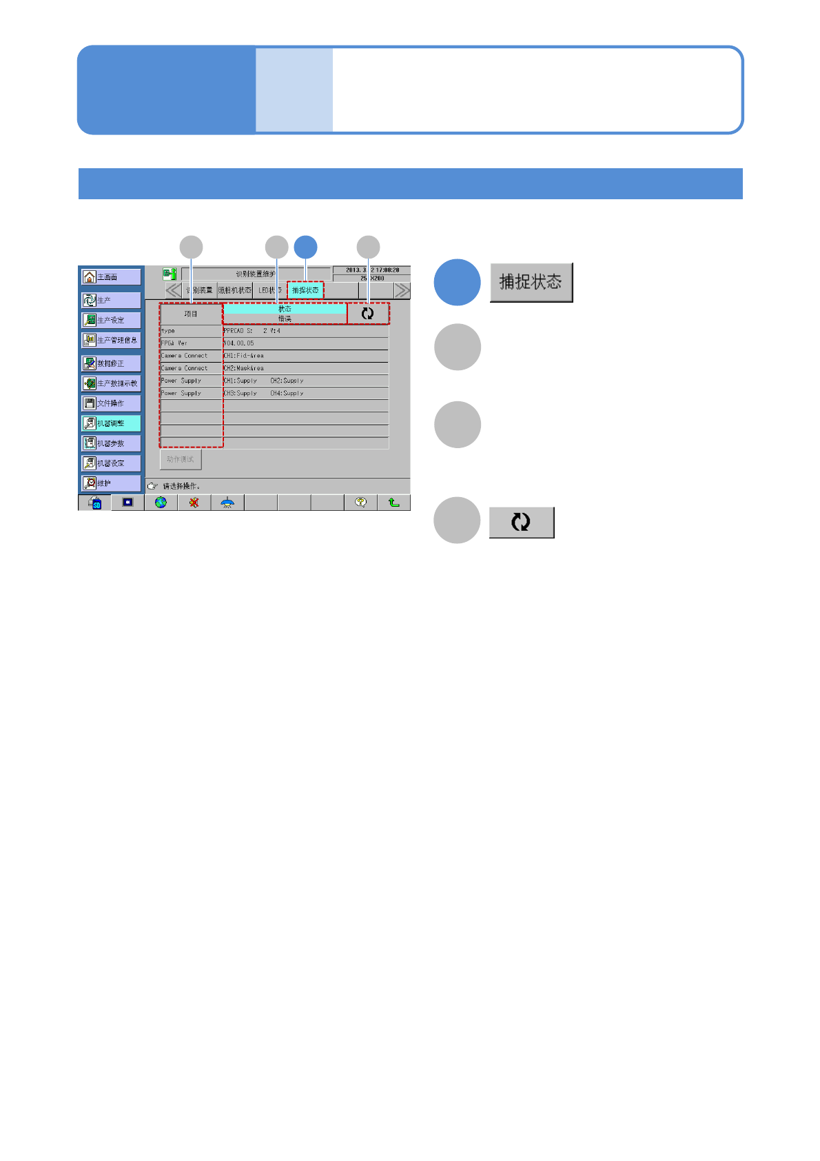SPG EJP6AJ-MB-05OM-03 机器 调整 识别装置的维护 3 操作篇 5-1-9 捕捉状态 显示贴装头照相机的捕捉状态以及各 种信息。 1 A B C 1 A B C 将捕捉状态更新为最新的信息。 5-1-9 -5 项目 显示正在显示中的数据项目。 状态 / 错误 切换一览表中的显示数据。 表示与项目相应的数据以及状态。