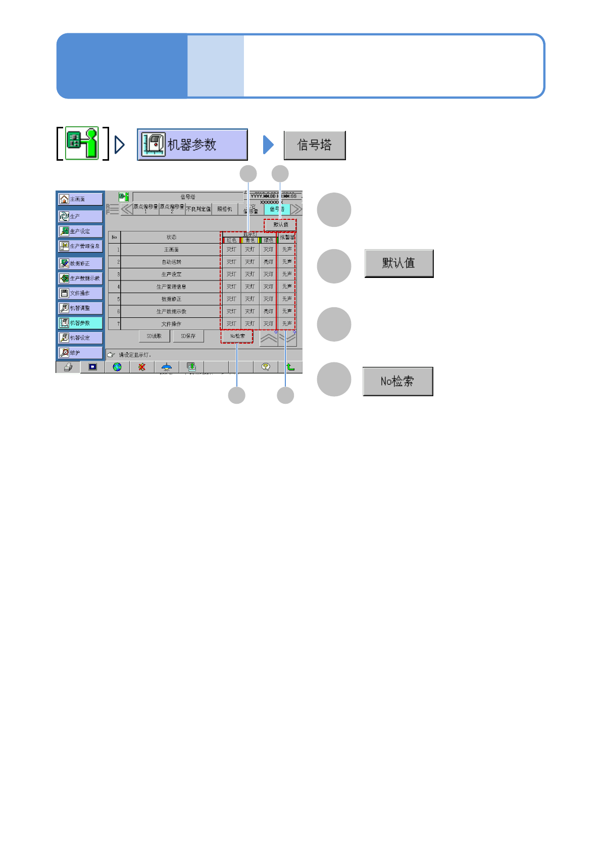 SPG EJP6AJ-MB-05OM-03 5-3-5 -1 机器 参数 信号塔 操作篇 5-3-5 显示灯 设定信号塔的各项目。 ●按熄灯 → 亮灯 → 闪烁的 顺序来切换。 所有的设定都回复到初始期。 报警器 设定警报音的各项目。 ●连续 → 间隔 → 静音的顺序来切 换。 输入第一个希望显示项目的编号。 A B C D C D A B