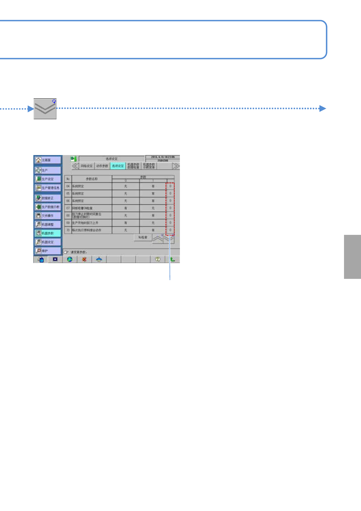 SPG EJP6AJ-MB-05OM-03 机器 参数 选购件设定 6 操作篇 5-3-7 点击选择 5-3-7 -11 72. 印压显示功能 在生产中完成印刷后,选择是否在画 面上显示印压 ( 施加给测压仪的力量 ) 。 73. 全开口锡膏检查 选择是否在生产中定期对全部的开口 都实施焊膏检 查。 74. 使用夹具爪 在对基板实施规正之际选择是否使用 夹具爪。