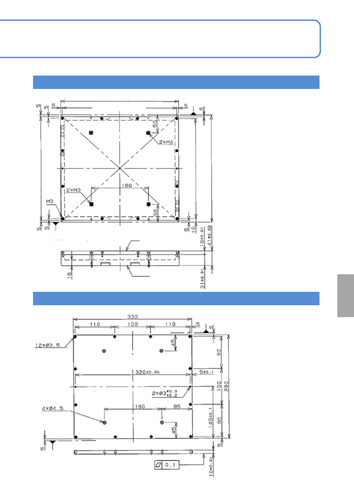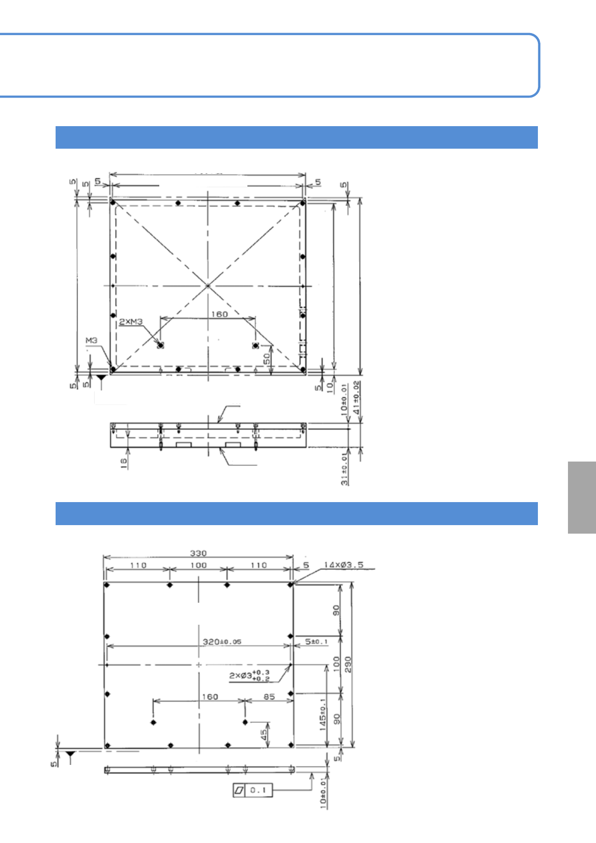 SPG EJP6AJ -MB-06O M-02 290( 基板宽度 -10) 2 × Ф 3 ± 0.005 深度 5 避开用 270( 基板宽度 -30) 材料 : 铝合金托板 (A2017) 处理 : 不要 箱定位用 选购件 基板吸着箱 2 吸着箱设计例子 ( 相对时 ) ■设计条件 基板尺寸 (L)350 × (W ) 300 mm 6-1-4 -3 操作篇 6-1-4 ( 单位: mm)