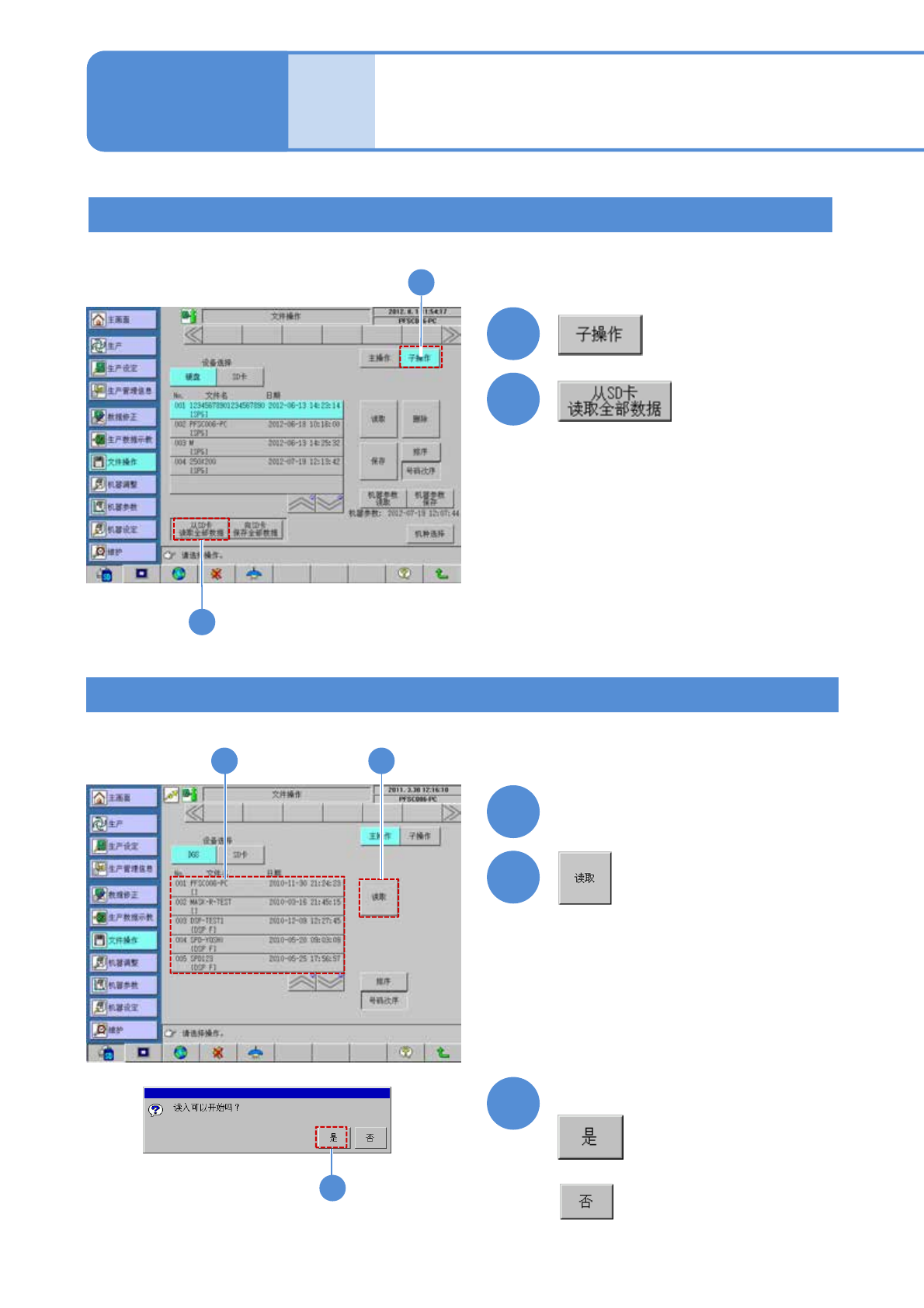 SPG EJP6AC-MB-0 2OM-02 2-2-3 -3 硬盘从 SD 卡读取生产数据 1 「硬盘操作」画面 ( → P.2-2-2 -1 ) 起 2 2 ( 将 SD 卡向的全部数据读取进硬盘 ) 文件 操作 操作篇 2-2-3 生产数据的读取 2 从 DGS 到存储器 从“ DGS 操作 ” 画面 ( → P.2-2-2 -1 ) 起 1 2 1 2 选择读取的数据 ( 所选择的数据以反转显示 ) 3 3 确认信息后 ●不读取…