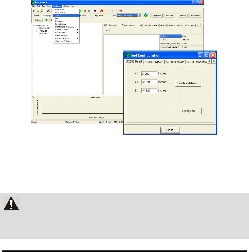 6-8 Configura ti on and C hara cterizat ion 6.7 Tool Configur ati on A tool cons ist s of a coating applicator and nozz le . The Tool Config uration dialog box allows you t o set the offset for ea ch tool and perform a c…