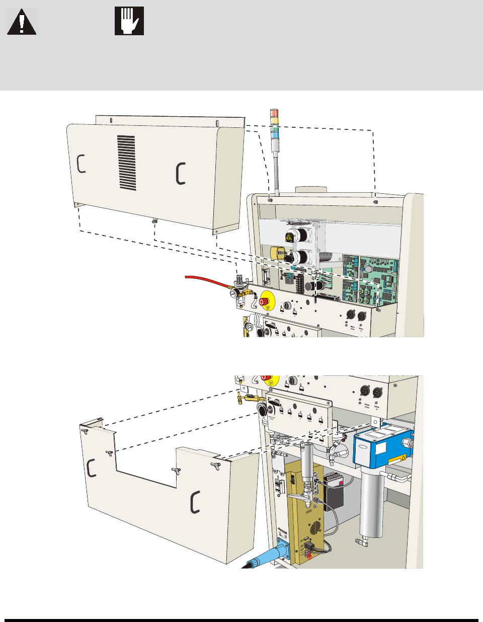 attempting to remove any panel. Remove doors, covers, and panels carefully to