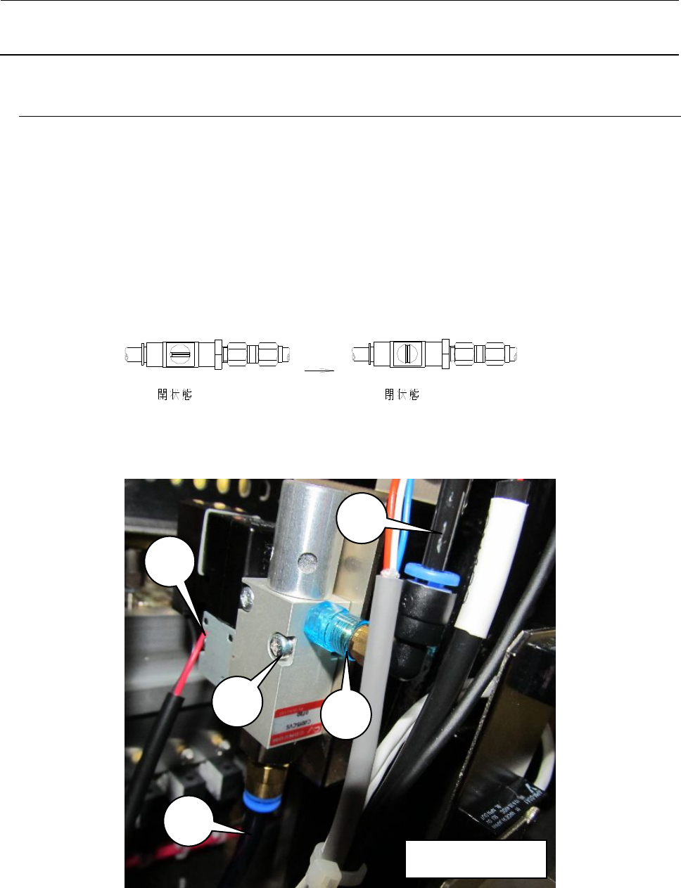 Rev. 1.0 维修调整要领书 6-2 6-2 . 取出器的更换 1) 请使本体左下方的手柄阀置于关闭状态。 2) 拆下 φ4 气管 ① 、 φ6 气管 ② 。 3) 卸下 CAL VCUM SV 组的线束 ③ 。 4) 请取下安装螺钉 ④ ( 2 颗),更换 CAL VCUM SV 组。 5) 安装请按相反的步骤进行。 滤清器 ⑤ 的更换不切断空气也可能 货号 40000641 品名 FILTER 切断空气供给 3 2 4 1 CA…