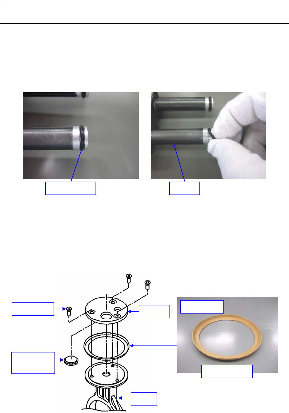 Rev. 1.1 维修调整要领书 9-10 { 更换 O 环 P-10 1 ) 用与更换密封垫一样手法,取下泵头盖和泵头支架。 2 ) O 环 P-10 安装到位于连接泵头罩之间的连接管内。事先,确认在 O 环上涂有真空黄油。 3 ) 插入连接管时,注意不要造成 O 环划伤,进行更换。( 1 根管内有 2 个) ※ 盖子的安装,请遵照密封圈的更换顺序实施。在更换其它消耗部件时,在不关闭盖子状态下参 照个部位的更换工程项目。 { 碗形密封…