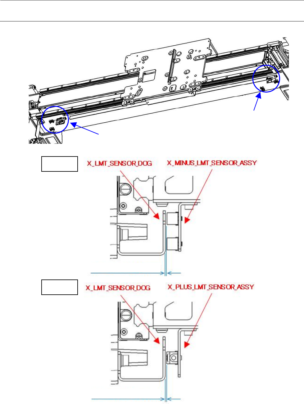 1) 松开 Y 极限传感器托架的止动螺丝进行调整,离开座架之开尾销安装中心位置的距离要成为下图