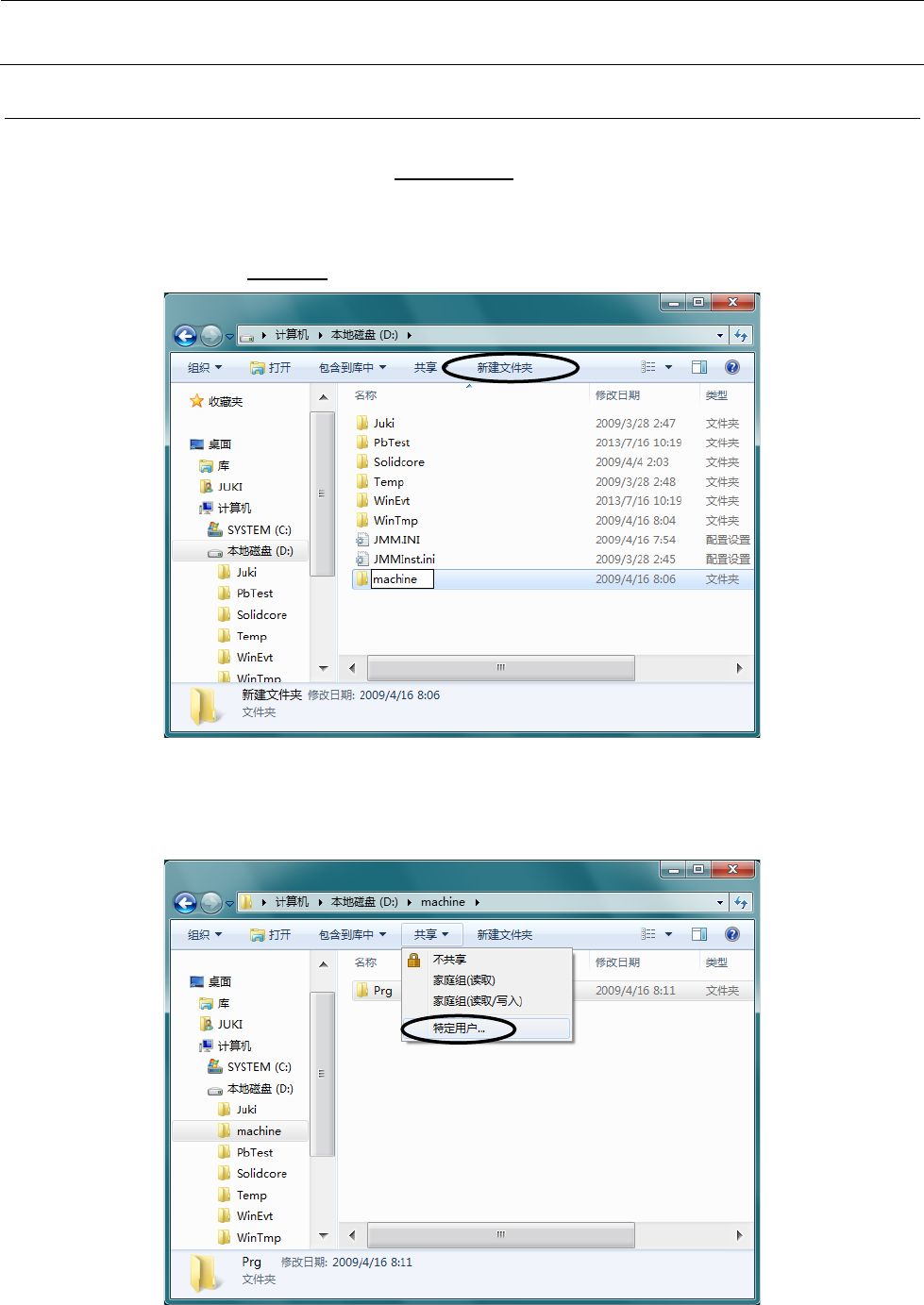 这里说明的是,在 D 驱动器下建立“D:\machine\Prg”文件夹,将 Prg 文件夹设置为共享。