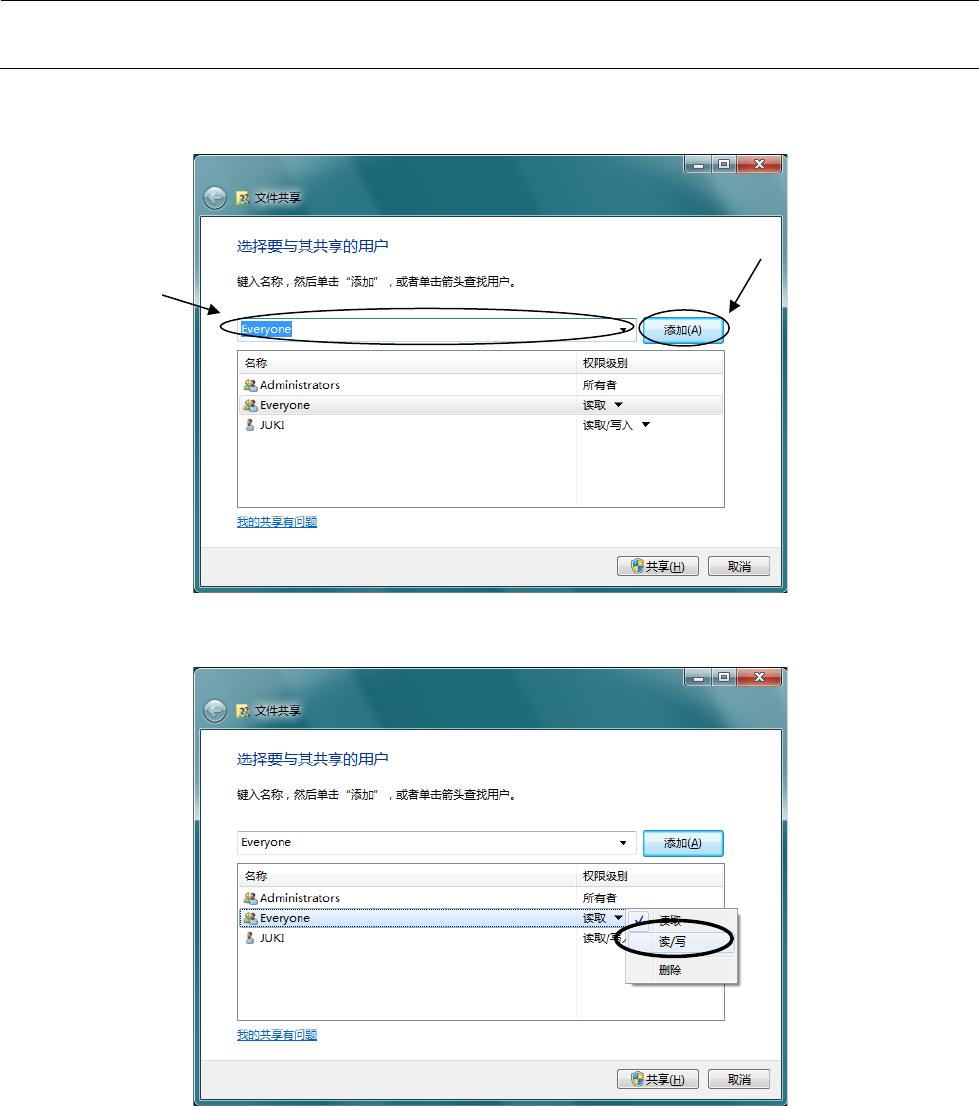 维修调整要领书 12 - 14 6) 会显示“文件共享”对话框,可打开① 下拉框或利用直接输入,在输入 了“ Every one ” 的状态 下选择②“添 加 ”。 7) 在上面的画面中 , Ev eryo ne 的 [ 权限级别 ] 默认为“读取 ” ,故请点 击这一部分,选 择“读 / 写 ”。 ① ②